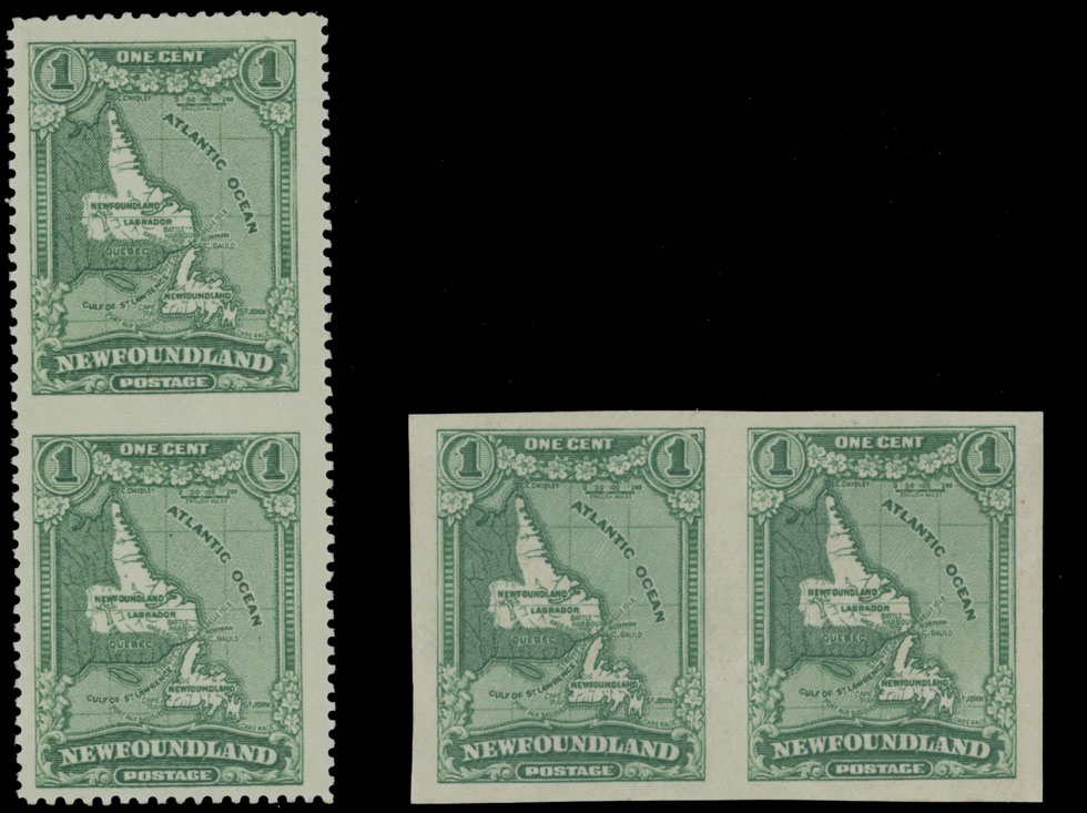 1929-31, Map of Newfoundland, 1c green, vertical pair imperforate between stamps and horizontal imperforate pair, full OG, NH (imperf pair) or VLH, VF, Unitrade C.v. CAD$590, Est. $200-$250 , Scott #163b, c