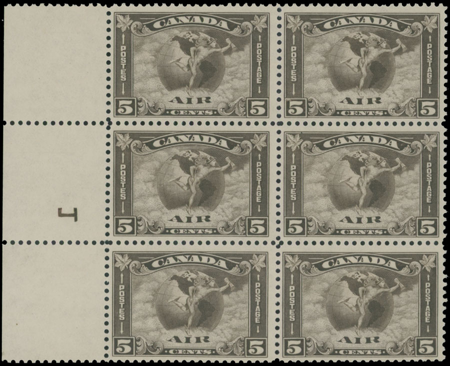 1930, Mercury, 5c olive brown, left sheet margin block of six (2×3) with reversed ”1” on the middle row of the edge, full OG, NH, F/VF, right stamps are VF, left ones with enlarged margin at right and balanced margins at three other sides, counted as fine, Unitrade C.v. CAD$1,100, Est. $600-$700, Scott #C2