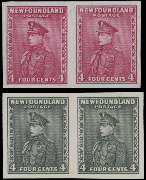 1932-37, Prince of Wales, 4c rose lake, horizontal imperforate pair on watermarked paper, in addition imperforate trial color proof of 4c in black, horizontal pair on thickened paper without watermark, full OG, NH or no gum as produced, VF, Unitrade C.v. CAD$112.50, plus Walsh NSSC #179g, C.v. US$520, Est. $200-$250, Scott #189a