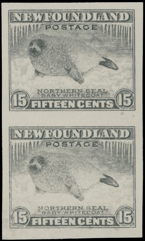 1932-37, Harp Seal, imperforate plate proof of 15c in black, vertical imperforate pair printed on paper without watermark, no gum as issued, NH, VF, Walsh NSSC 188f, C.v. US$500, Est. $200-$250 , Scott #195