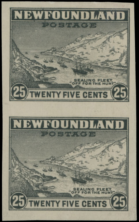 1932-37, Sealing Fleet, imperforate trial color proof of 25c in black, vertical pair printed on paper without watermark, no gum as issued, NH, VF, Walsh NSSC 191g, C.v. US$460, Est. $200-$250 , Scott #197