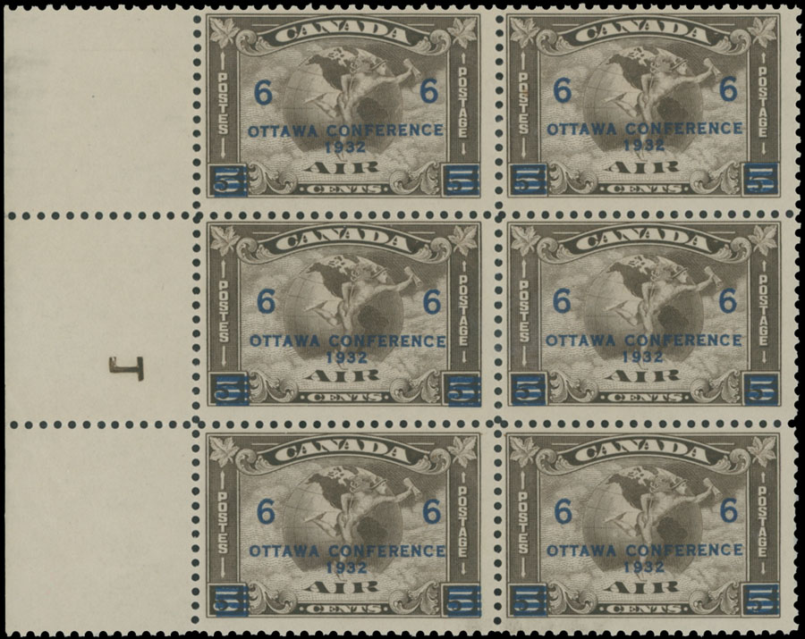1932, blue surcharge ”OTTAWA CONFERENCE” 6(c) on Mercury 5c olive brown, left sheet margin block of six (2×3) with reversed ”1” on the middle row of the edge, full OG, NH, fine, Unitrade C.v. CAD$900, Est. $300-$400 , Scott #C5