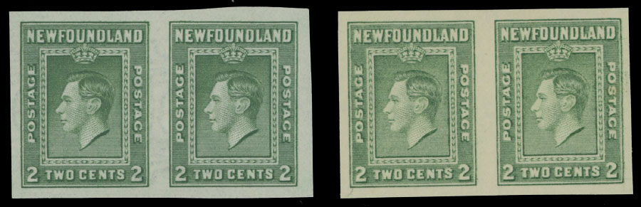 1938, King George VI, 2c green, horizontal imperforate pair and horizontal imperforate pair proofs of 3c in green, printed on thickened paper without watermark, full OG or no gum as issued, both NH and VF, Unitrade C.v. CAD $300 plus Walsh NSSC228i, C.v. US$360, Est. $300-$400, Scott #245a