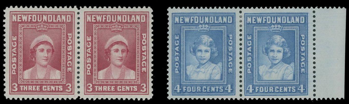 1938, Queen Elizabeth, 3c dark carmine, Princess Elizabeth, 4c light blue, two horizontal pairs, left or right stamps respectively without watermark, full OG, NH or LH, VF, Unitrade #246iii, 247ii, C.v. CAD$600, Est. $150-$200 , Scott #246-47 var