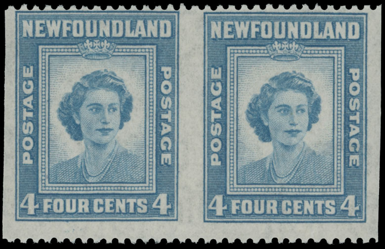 1947, 4c light blue, horizontal pair imperforate vertically, full OG, NH, fine and scarce, Unitrade C.v. CAD$450, Est. $150-$200 , Scott #269b