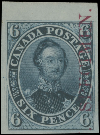 1851, Prince Albert, top margin imperforate trial color proof of 6p in gray blue, vertical SPECIMEN overprint in carmine, printed on India paper, no gum as issued, VF, Unitrade #2TCxi, C.v. CAD$500, Est. $150-$180 , Scott #2