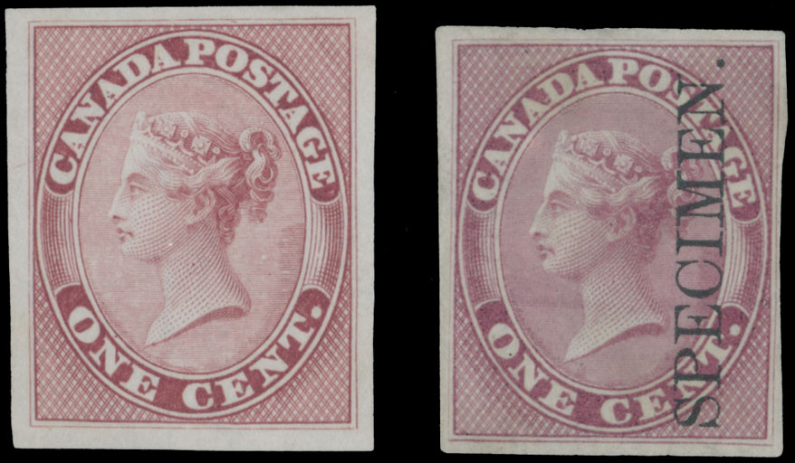 1859, Queen Victoria, two imperforate proofs in rose, one with vertical SPECIMEN overprint in black, printed on India paper, no gum as produced, VF, Unitrade #14P, Pi, C.v. CAD$500, Est. $150-$180 , Scott #14