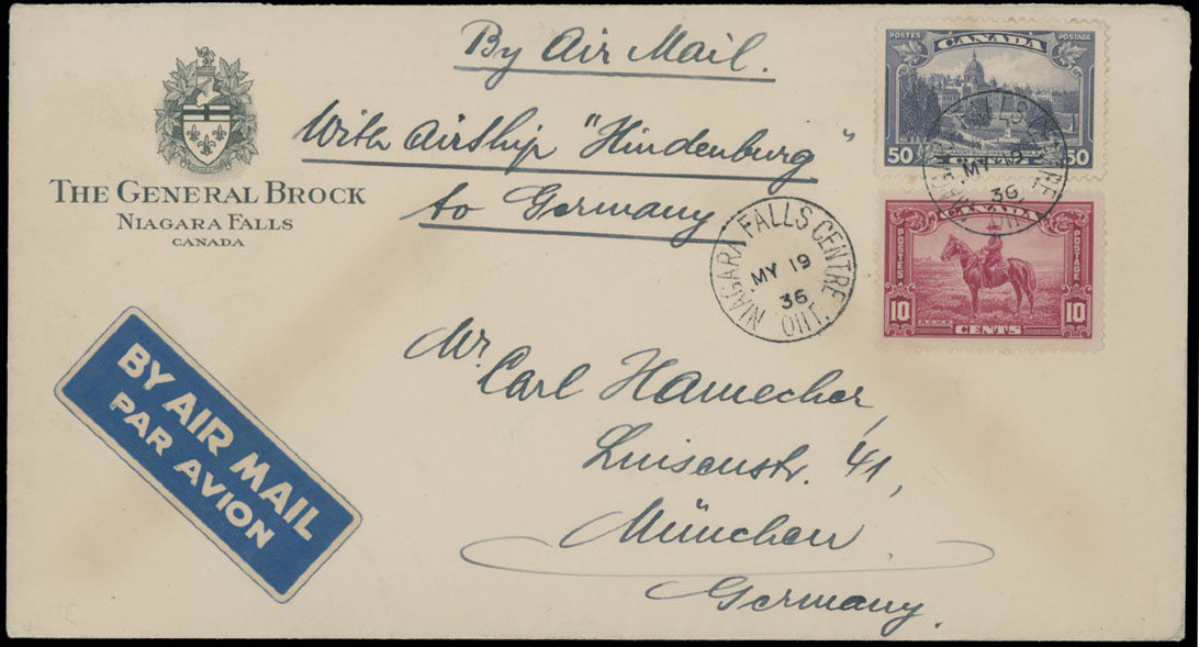 1936 (May 20-23), Hindenburg Second NA Return Flight pre-printed cover (The General Brook (Hotel) Niagara Falls. Canada), addressed to Munich, franked by two stamps of the Pictorial issue, tied by Niagara Falls ”MY.19.36” date stamps, bilingual ”By Air Mail” label and endorsement ”With Airship ”Hindenburg” to Germany”, no backstamp, fresh, VF and rare, expertized by Roger Koerber, Sieger #411C, C.v. €500, Est. $500-$600, Scott #223, 226