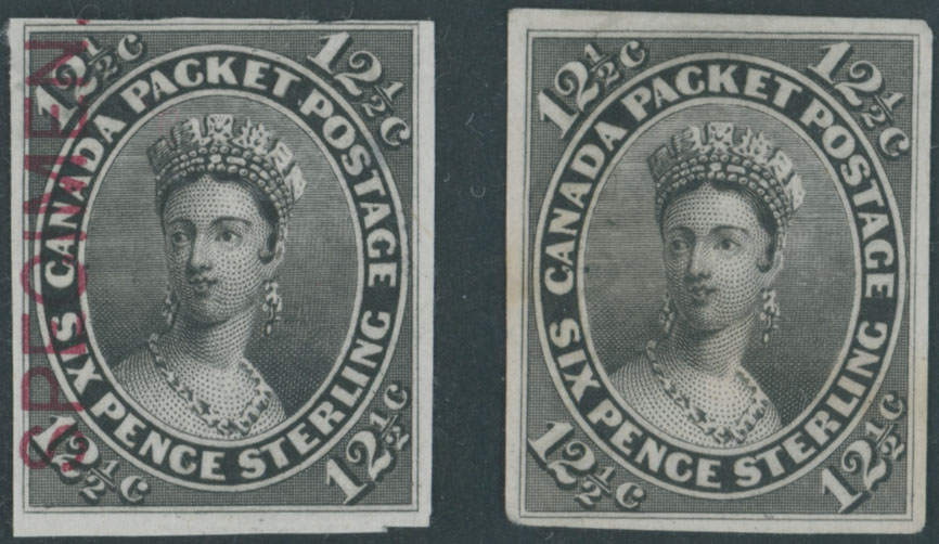 1859, Queen Victoria, two imperforate trial color proofs of 12½c in black, first one with vertical overprint SPECIMEN in carmine (type A) at left, printed on India paper, no gum as issued, VF and scarce, Unitrade #18TCx,ix, C.v. CAD $1,300, Est. $400-$500, Scott #18