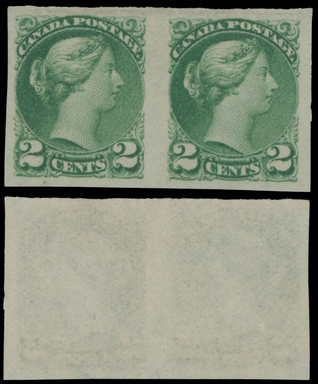 1872, 2c green, horizontal imperforate pair, Ottawa printing on white paper, fresh quality, unused, no gum, VF, Unitrade #36v, C.v. CAD$900, Est. $250-$300 , Scott #36a var