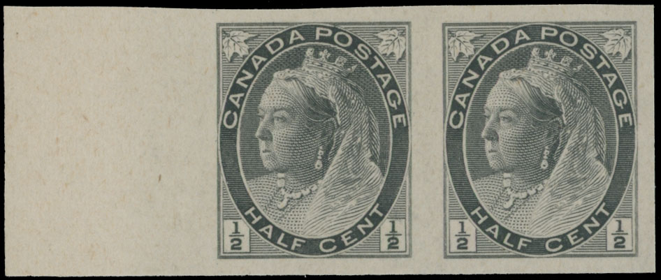 1898, ½c black, left sheet margin horizontal imperforate pair printed on vertical wove paper, no gum as produced, VF, Unitrade #74v, C.v. CAD$500, Est. $150-$180 , Scott #74a var