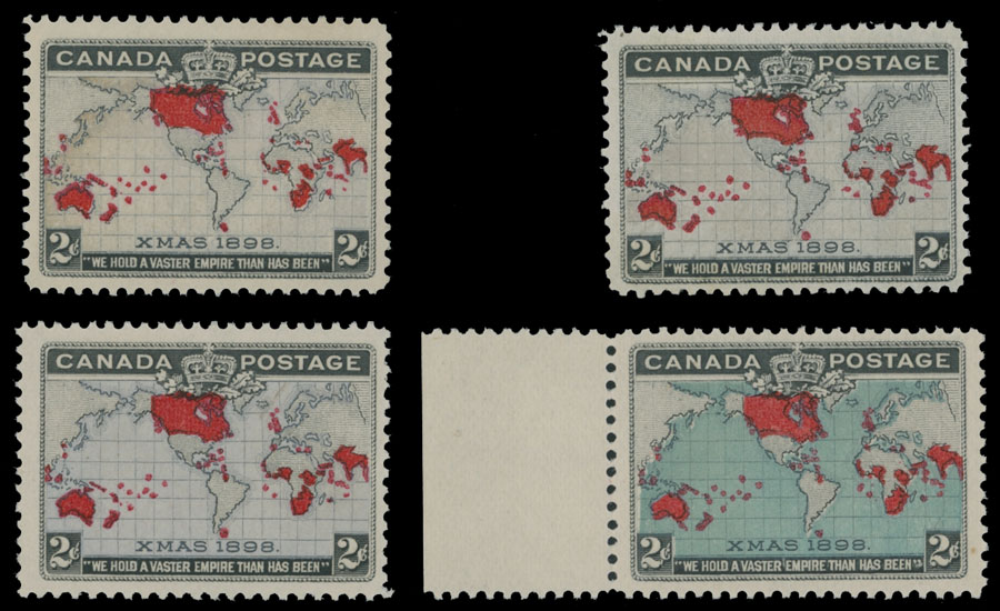 1898, Map of the British Empire, two of 2c in black, red and lavender or gray; two of 2c in black, red, and blue or deep blue, all with full OG, NH, VF, Unitrade #85, i, 86, b, C.v. CAD$810, Est. $150-$200, Scott #85-86, var