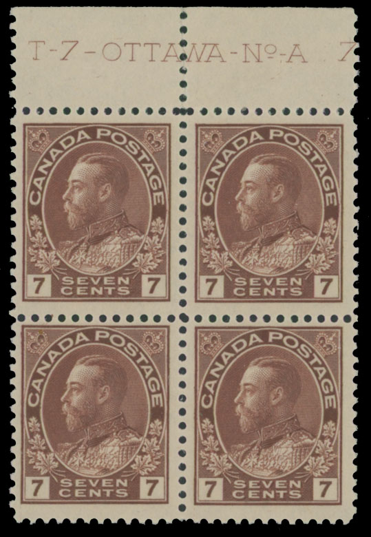1924, 7c red brown, dry printing, top sheet margin imprint block of four, full OG, NH, VF, Unitrade C.v. CAD$420 as singles, Est. $100-$120 , Scott #114