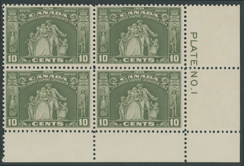 1934, 10c olive green, bottom right corner sheet margin plate No.1 block of four, full OG, NH, VF, Unitrade C.v. CAD$480, Est. $150-$180 , Scott #209