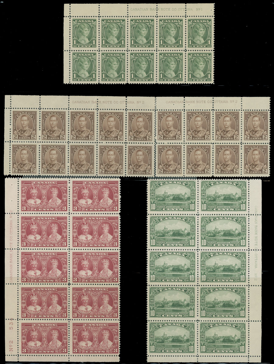 1935, plate blocks selection, 1c in block of 10 (top), 2c in blocks of 8 and 10 (top), 3c in block of 10 (left), 10c in block of 10 (right), full OG, NH, F/VF, Unitrade C.v. CAD$385, Est. $100-$120 , Scott #211-13, 215