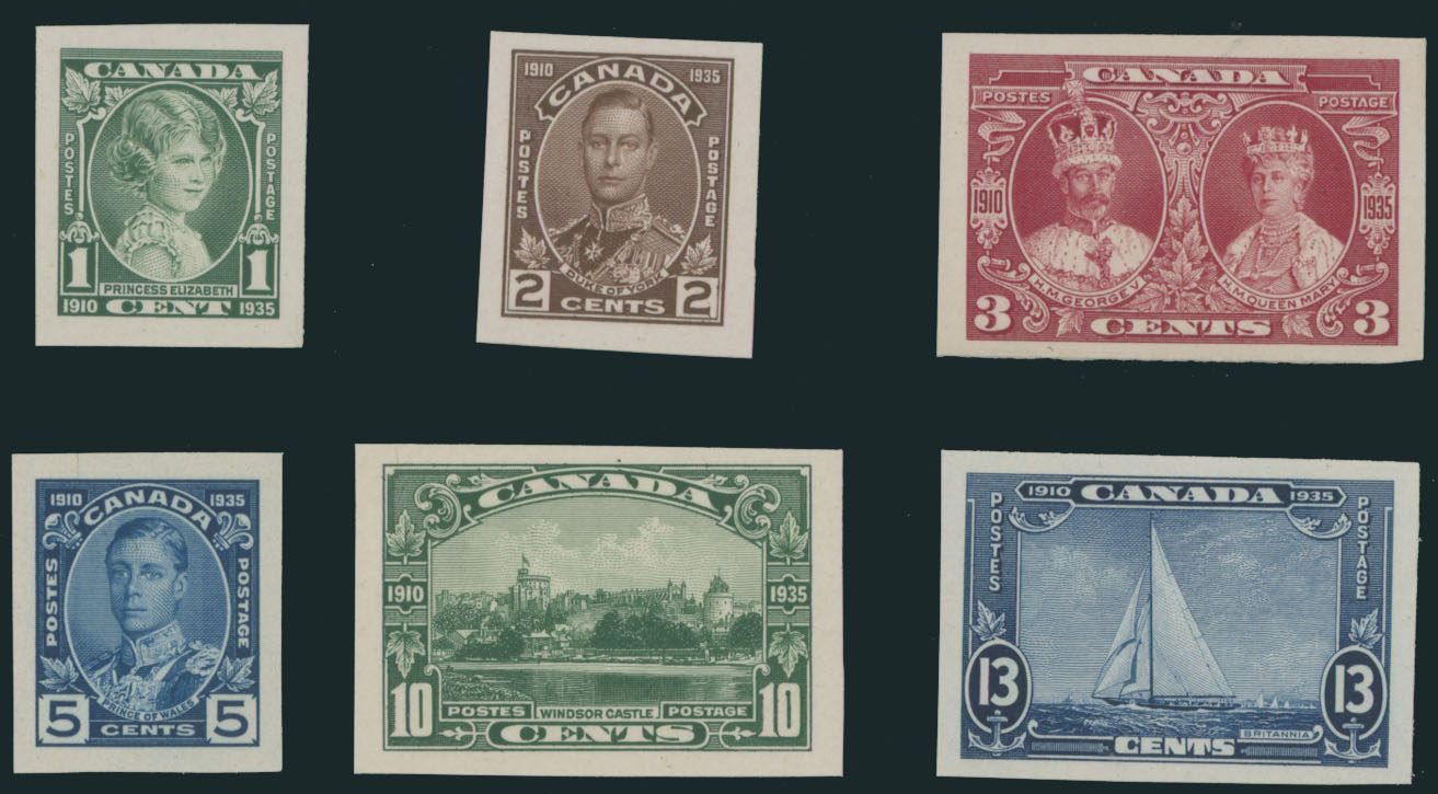 1935, plate proofs of 1c-13c, complete set of six printed on India paper mounted on cards, penciled numbers on reverse, no gum as issued, NH, VF, Unitrade C.v. CAD $750, Est. $200-$250 , Scott #211-16