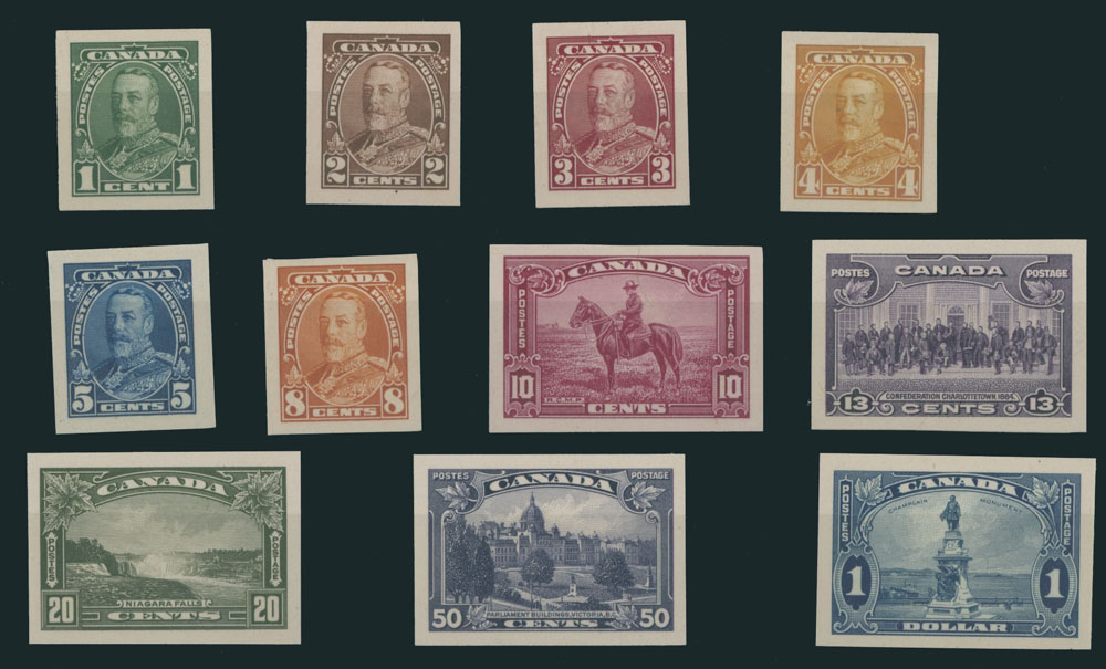 1935, imperforate plate proofs of 1c-$1, complete set of 11 printed on India paper and mounted on cards, nice margins, VF, Unitrade C.v. CAD$1,800, Est. $600-$700 , Scott #217-27