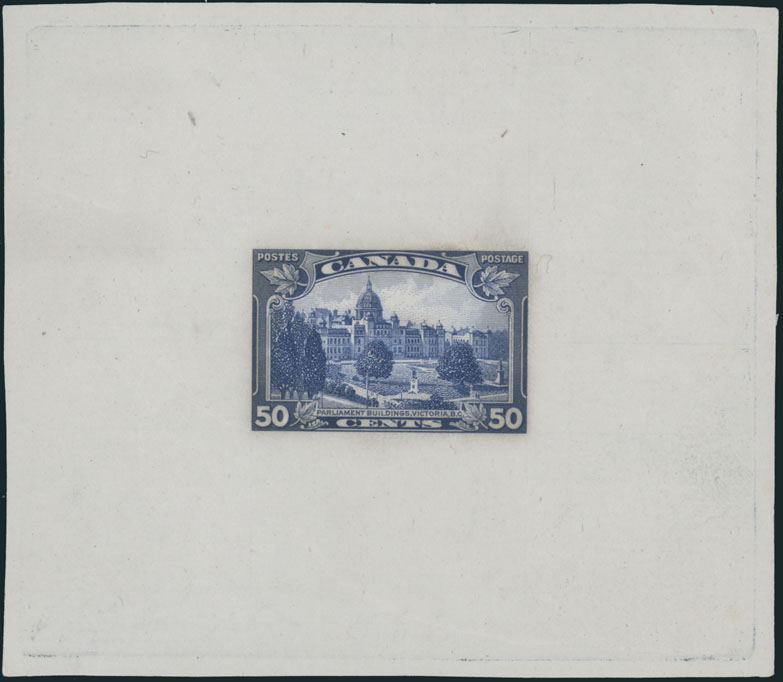 1935, Parliament Building in Victoria, large die proof of 50c in violet blue, printed on India paper, size 92x86mm, no printer’s inscription, fresh, VF and rare, only a few exists, BNA NSSC190dp10, C.v. US$1,500, Est. $600-$700 , Scott #226