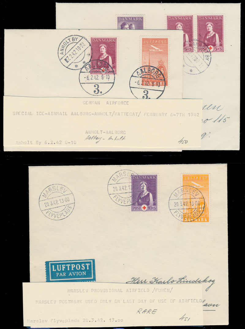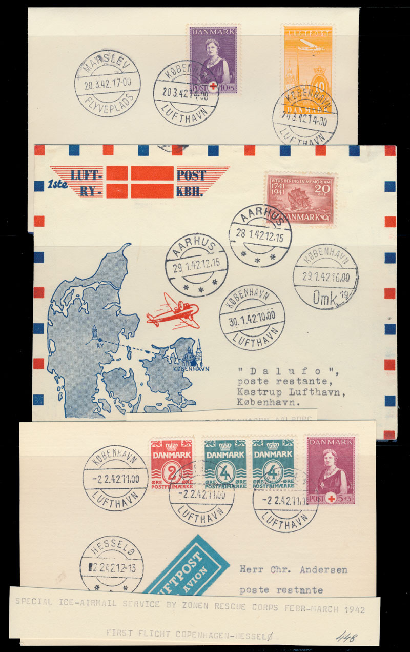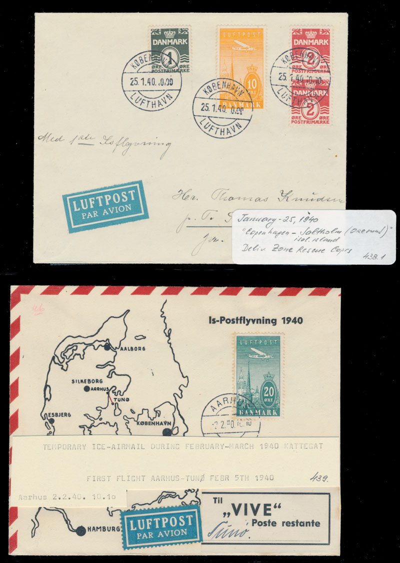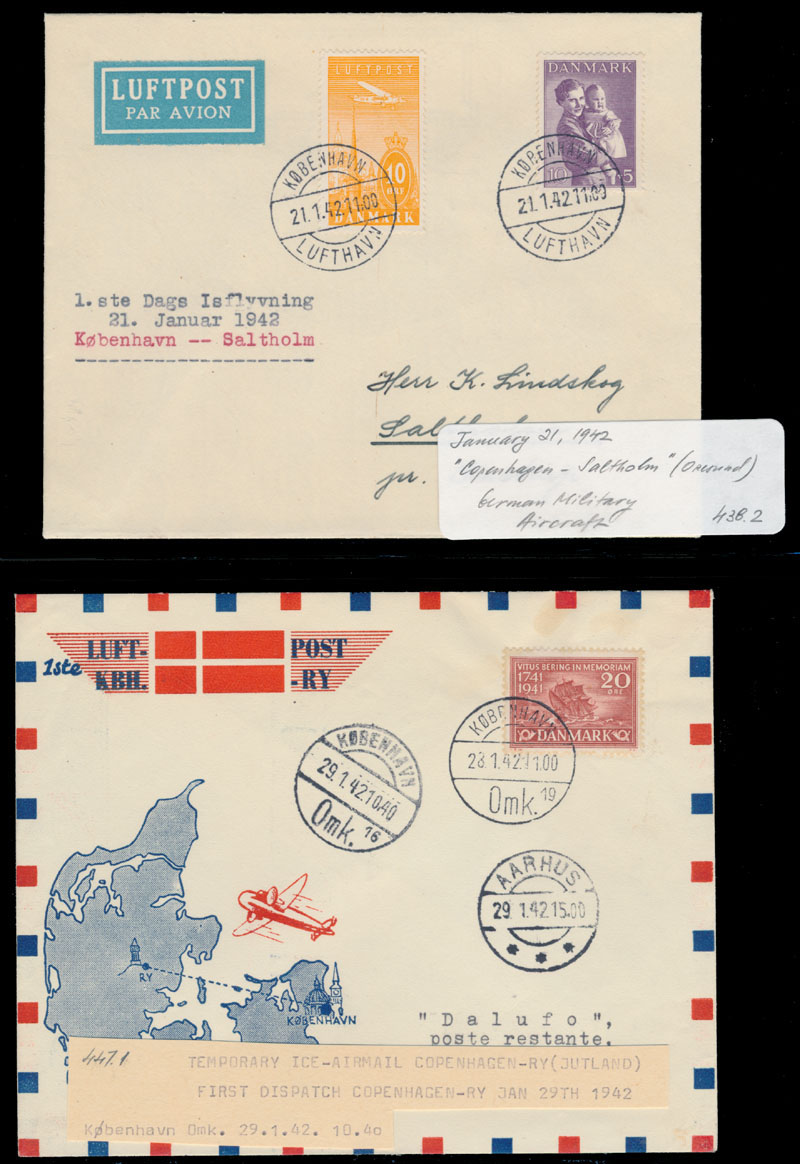 TEMPORARY ICE AIRMAIL SERVICE: 1940-42, 19 covers delivered during January- March of each year by Danish Air Forces or German military airplanes, nicely franked and illustrated with map and flight itineraries, bearing all appropriate markings, well described on stockpages, VF and rare group, ex-Otto Luening prominent air post specialist, Est. $800-$1,000