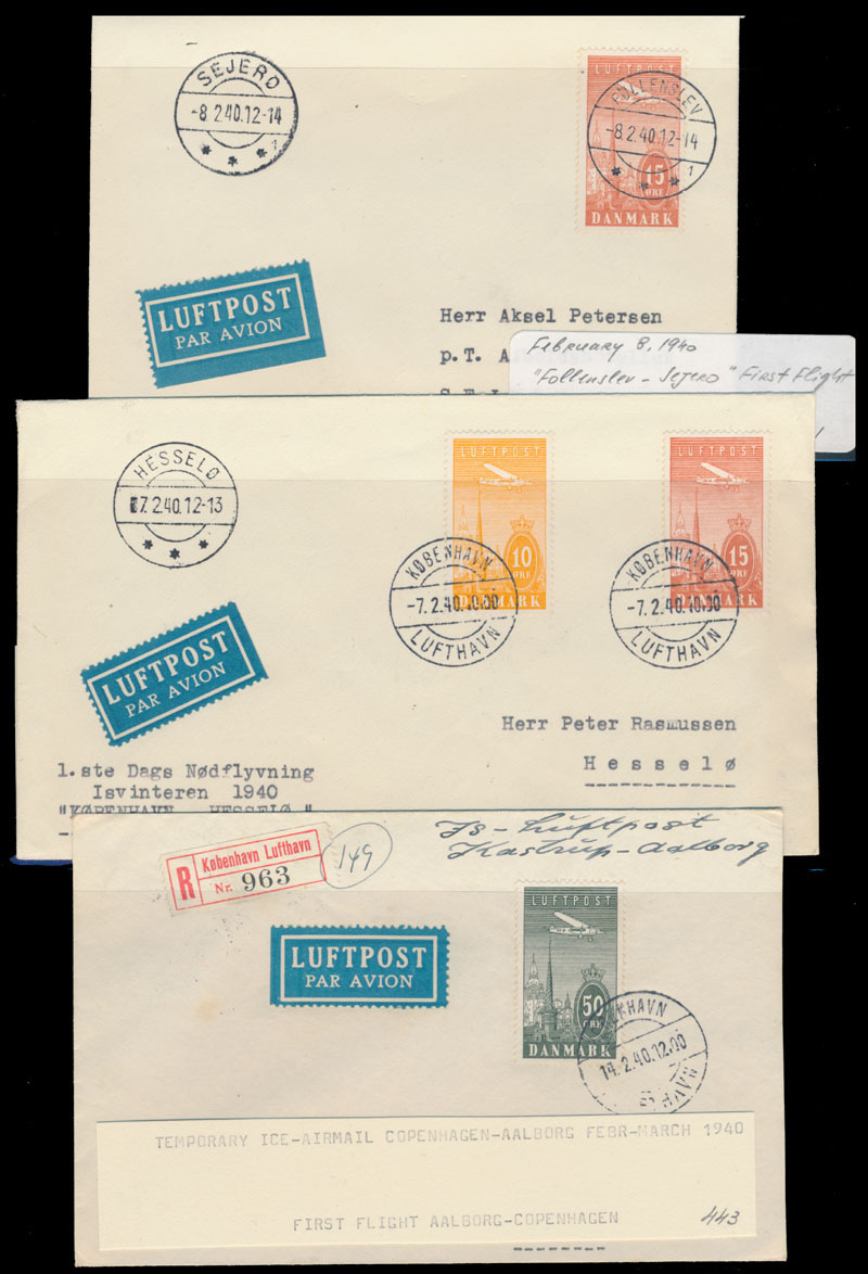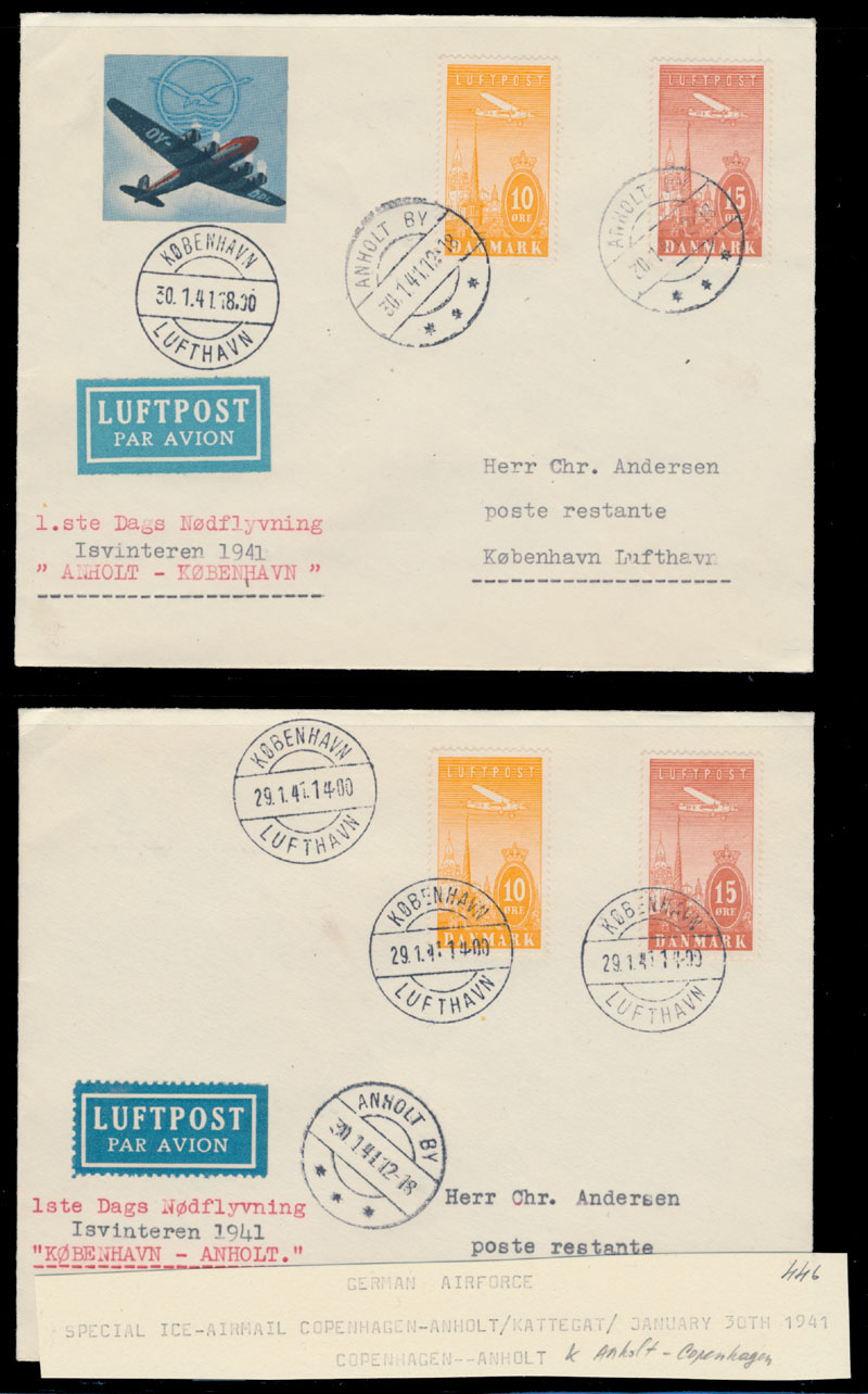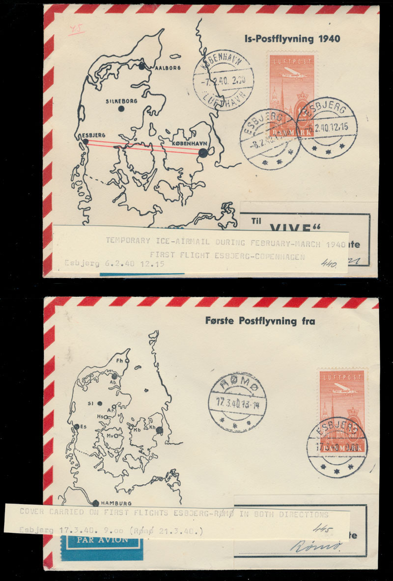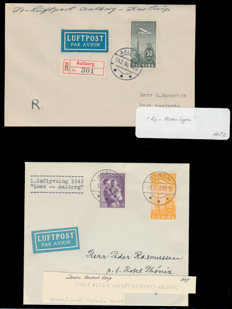 TEMPORARY ICE AIRMAIL SERVICE: 1940-42, 19 covers delivered during January- March of each year by Danish Air Forces or German military airplanes, nicely franked and illustrated with map and flight itineraries, bearing all appropriate markings, well described on stockpages, VF and rare group, ex-Otto Luening prominent air post specialist, Est. $800-$1,000