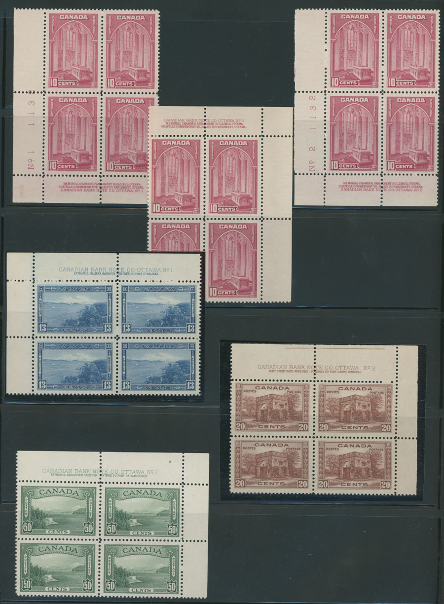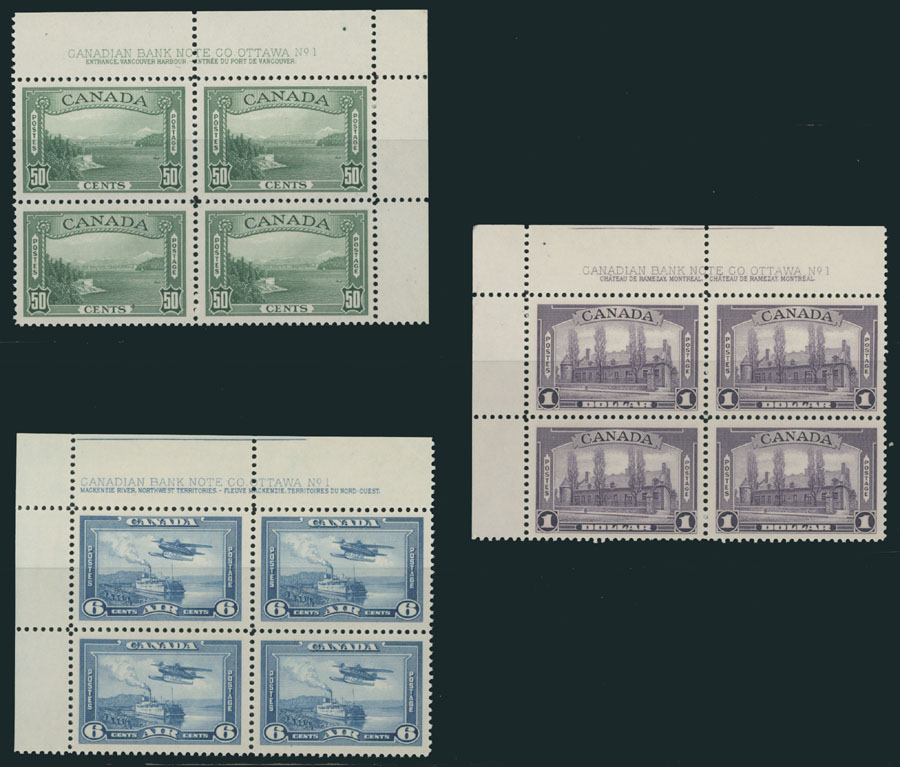 1938, group of plate blocks of four, 10c carmine rose – 3 blocks, one of each for 13c and 20c, 50c – two blocks, one of each for $1 and air post 6c, full OG, NH, VF, Unitrade C.v. CAD$2,350, Est. $500-$600 , Scott #241a-45, C6