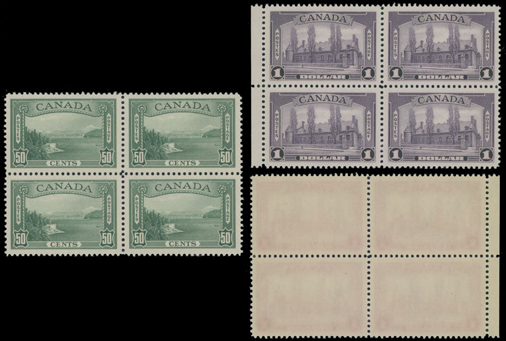 1938, Vancouver Harbor, 50c green; Chateau de Ramezay, $1 aniline violet, two blocks of four, both are perfectly centered with jumbo margins all around, full OG, NH, XF, Unitrade #244, 245i, C.v. CAD$1,200, Est. $300-$350 , Scott #244-45 var