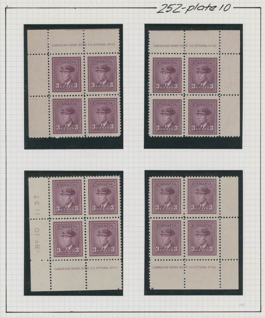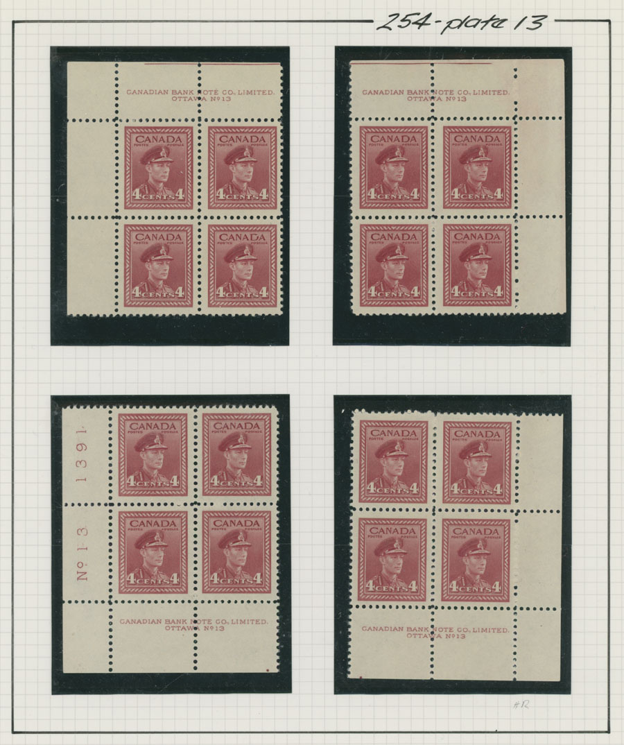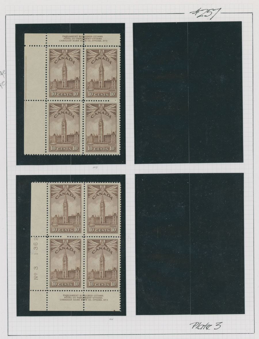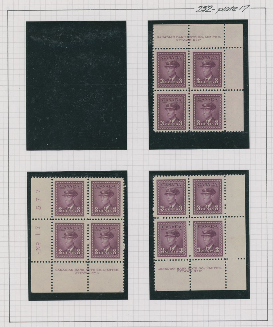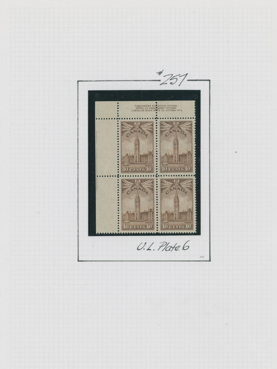 PLATE BLOCKS COLLECTION: 1942-43, 1c-8c and 10c-$1, the total is 430 blocks, including 79 matched sets (blocks from all four corners), by value – 1c – 98 blocks, 19 sets; 2c – 24 blocks, 6 sets; 3c carmine – 31 blocks, 5 sets; 3c rose violet – 95 blocks, 20 sets; 4c green black – 4 blocks, 1 set; 4c dark carmine – 129 blocks, 18 sets; 5c – 16 blocks, 4 sets; 8c – 4 blocks, 1 set; 10c – 7 blocks; 13c – 4 blocks, 1 set; 14c – 4 blocks, 1set; 20c – 6 blocks, 1 set; 50c – 4 blocks, 1 set; and $1 – 4 blocks, 1 set; occasional hinges or minor flaws possible, generally nice centering and perfect condition, full OG, NH, VF, Unitrade C.v. CAD$10,900++, Est. $1,500-$2,000, Scott #249-62