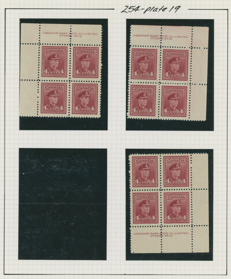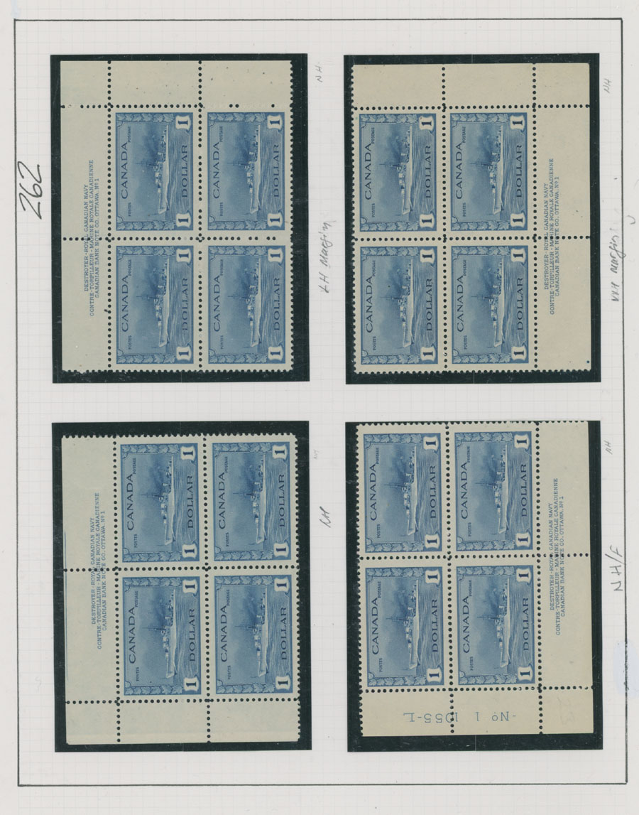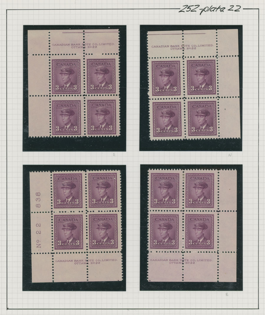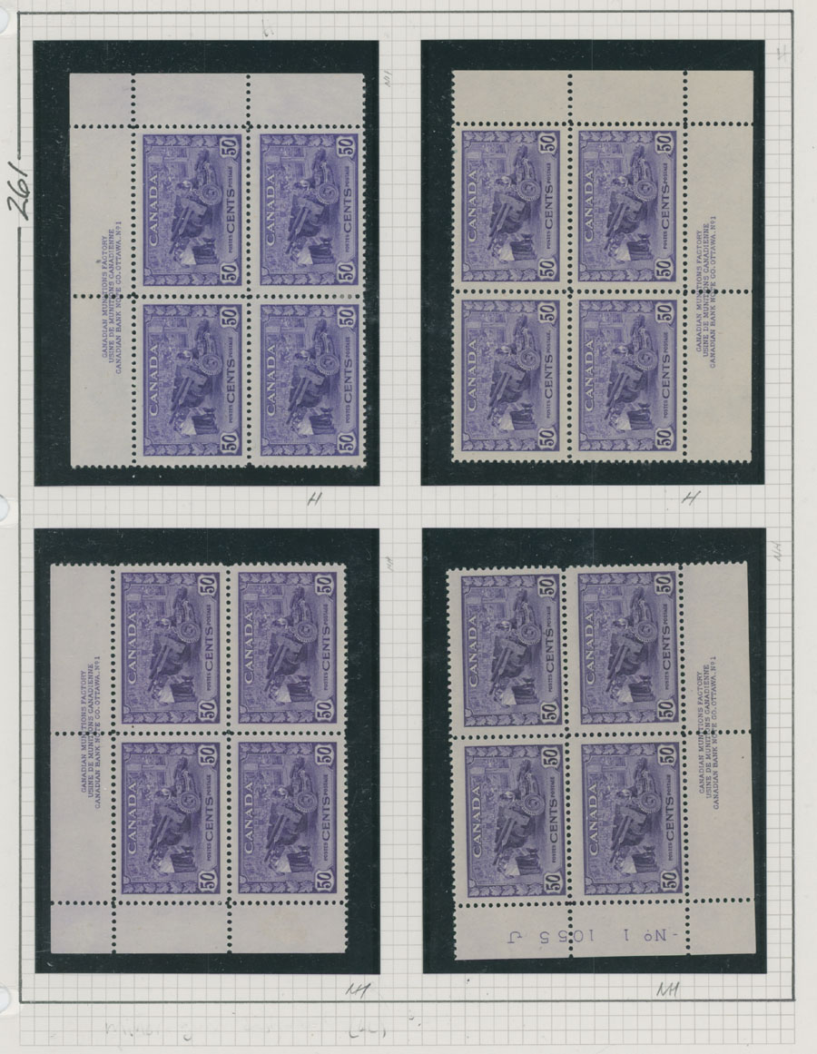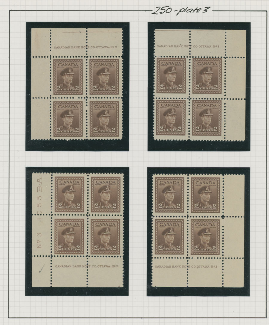 PLATE BLOCKS COLLECTION: 1942-43, 1c-8c and 10c-$1, the total is 430 blocks, including 79 matched sets (blocks from all four corners), by value – 1c – 98 blocks, 19 sets; 2c – 24 blocks, 6 sets; 3c carmine – 31 blocks, 5 sets; 3c rose violet – 95 blocks, 20 sets; 4c green black – 4 blocks, 1 set; 4c dark carmine – 129 blocks, 18 sets; 5c – 16 blocks, 4 sets; 8c – 4 blocks, 1 set; 10c – 7 blocks; 13c – 4 blocks, 1 set; 14c – 4 blocks, 1set; 20c – 6 blocks, 1 set; 50c – 4 blocks, 1 set; and $1 – 4 blocks, 1 set; occasional hinges or minor flaws possible, generally nice centering and perfect condition, full OG, NH, VF, Unitrade C.v. CAD$10,900++, Est. $1,500-$2,000, Scott #249-62