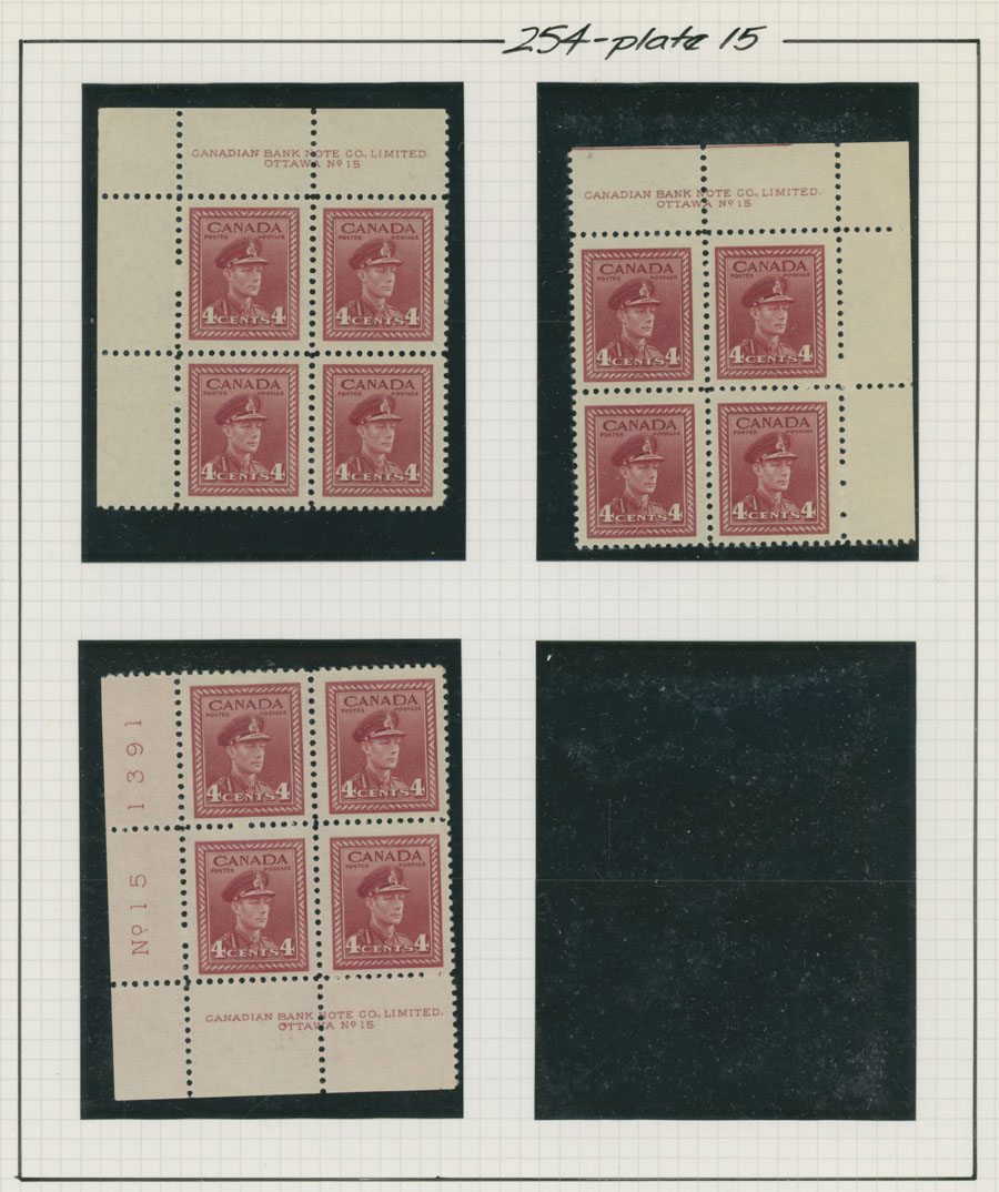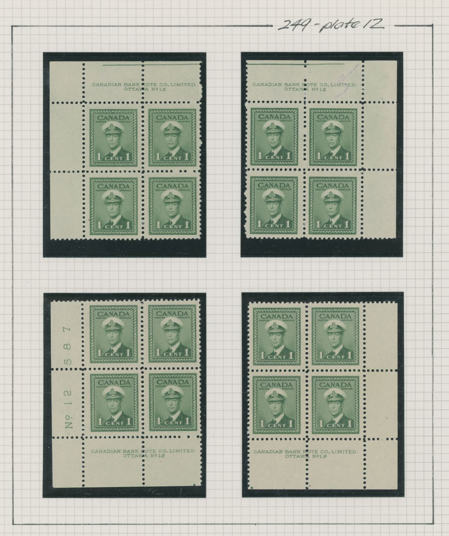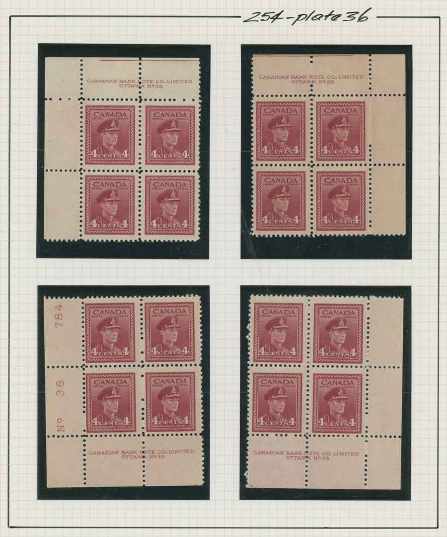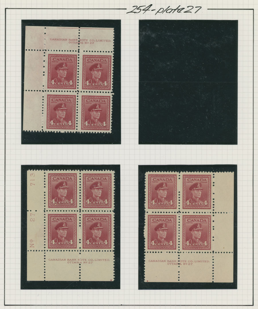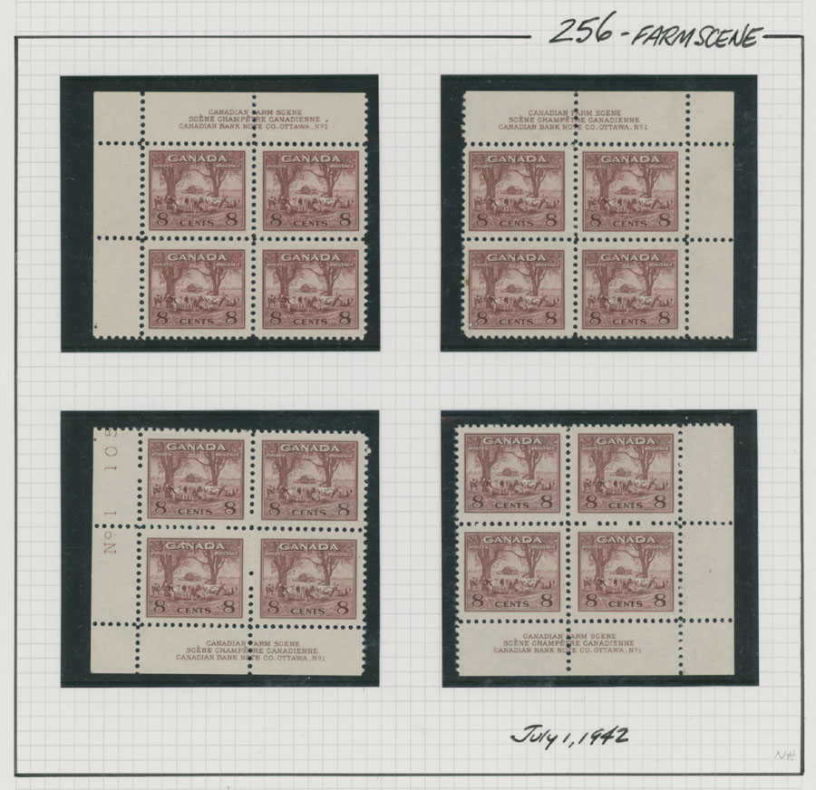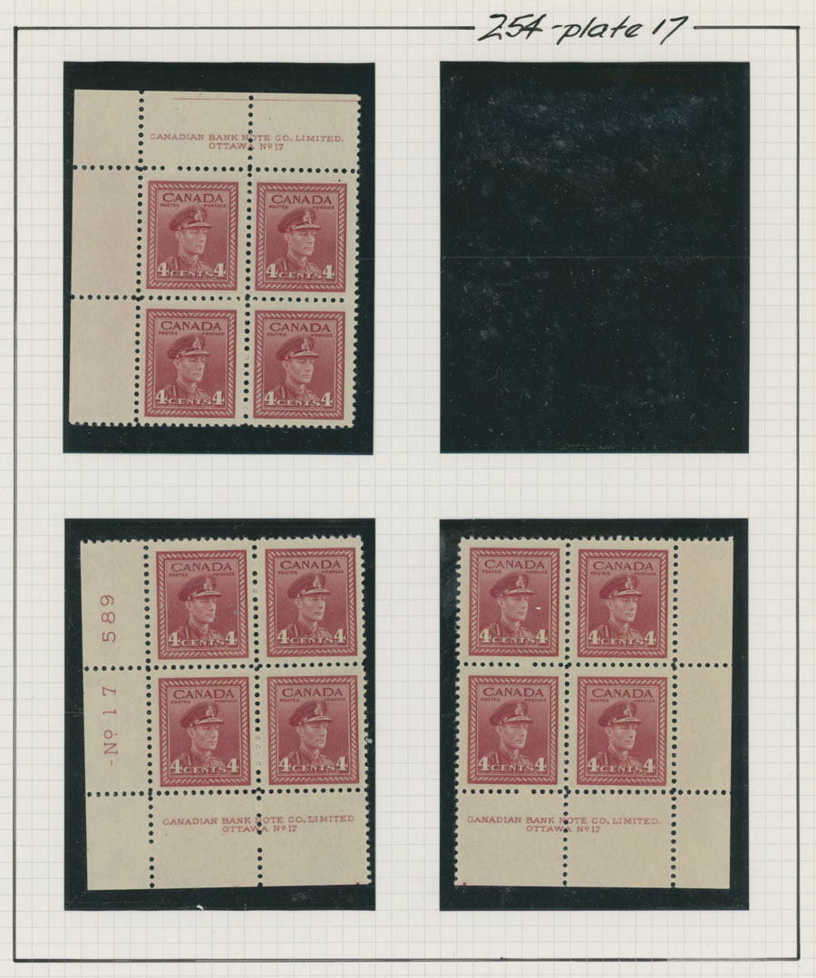 PLATE BLOCKS COLLECTION: 1942-43, 1c-8c and 10c-$1, the total is 430 blocks, including 79 matched sets (blocks from all four corners), by value – 1c – 98 blocks, 19 sets; 2c – 24 blocks, 6 sets; 3c carmine – 31 blocks, 5 sets; 3c rose violet – 95 blocks, 20 sets; 4c green black – 4 blocks, 1 set; 4c dark carmine – 129 blocks, 18 sets; 5c – 16 blocks, 4 sets; 8c – 4 blocks, 1 set; 10c – 7 blocks; 13c – 4 blocks, 1 set; 14c – 4 blocks, 1set; 20c – 6 blocks, 1 set; 50c – 4 blocks, 1 set; and $1 – 4 blocks, 1 set; occasional hinges or minor flaws possible, generally nice centering and perfect condition, full OG, NH, VF, Unitrade C.v. CAD$10,900++, Est. $1,500-$2,000, Scott #249-62