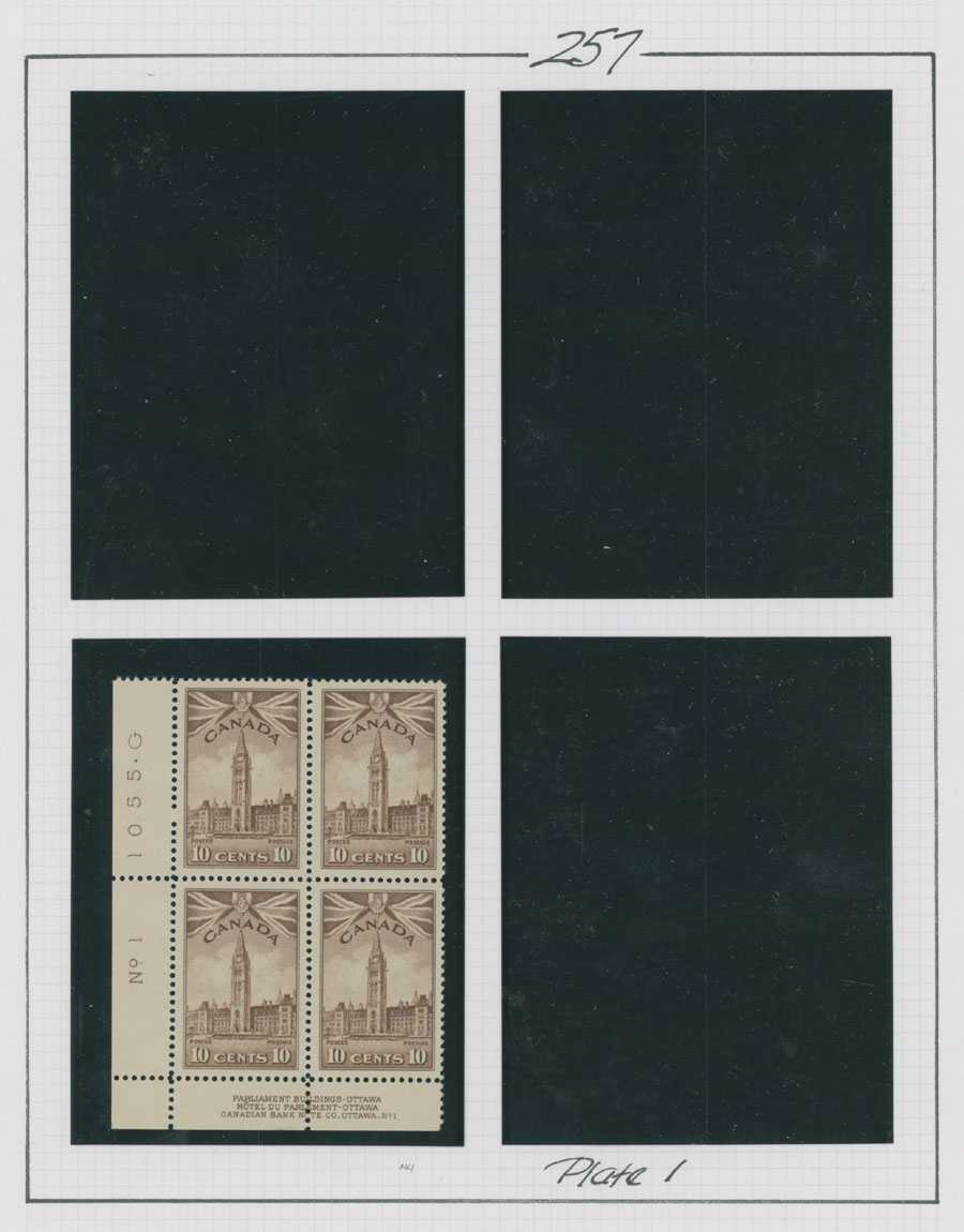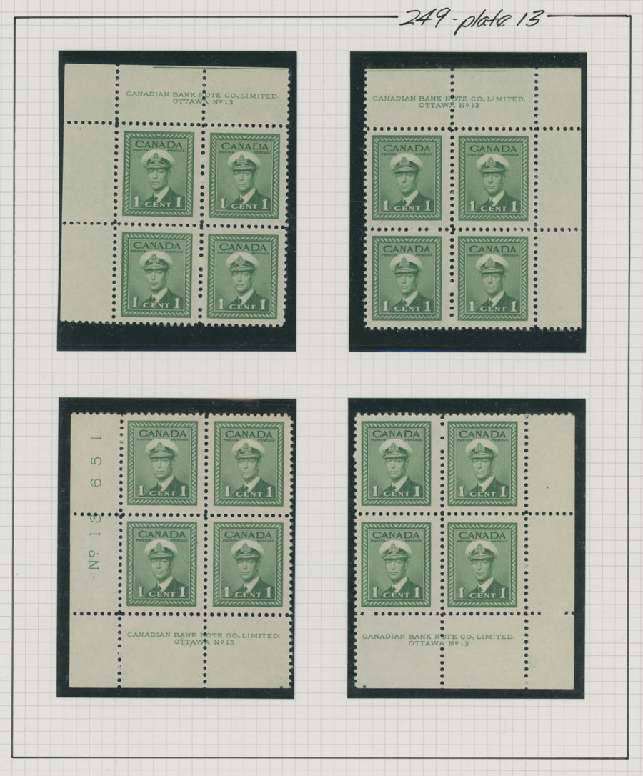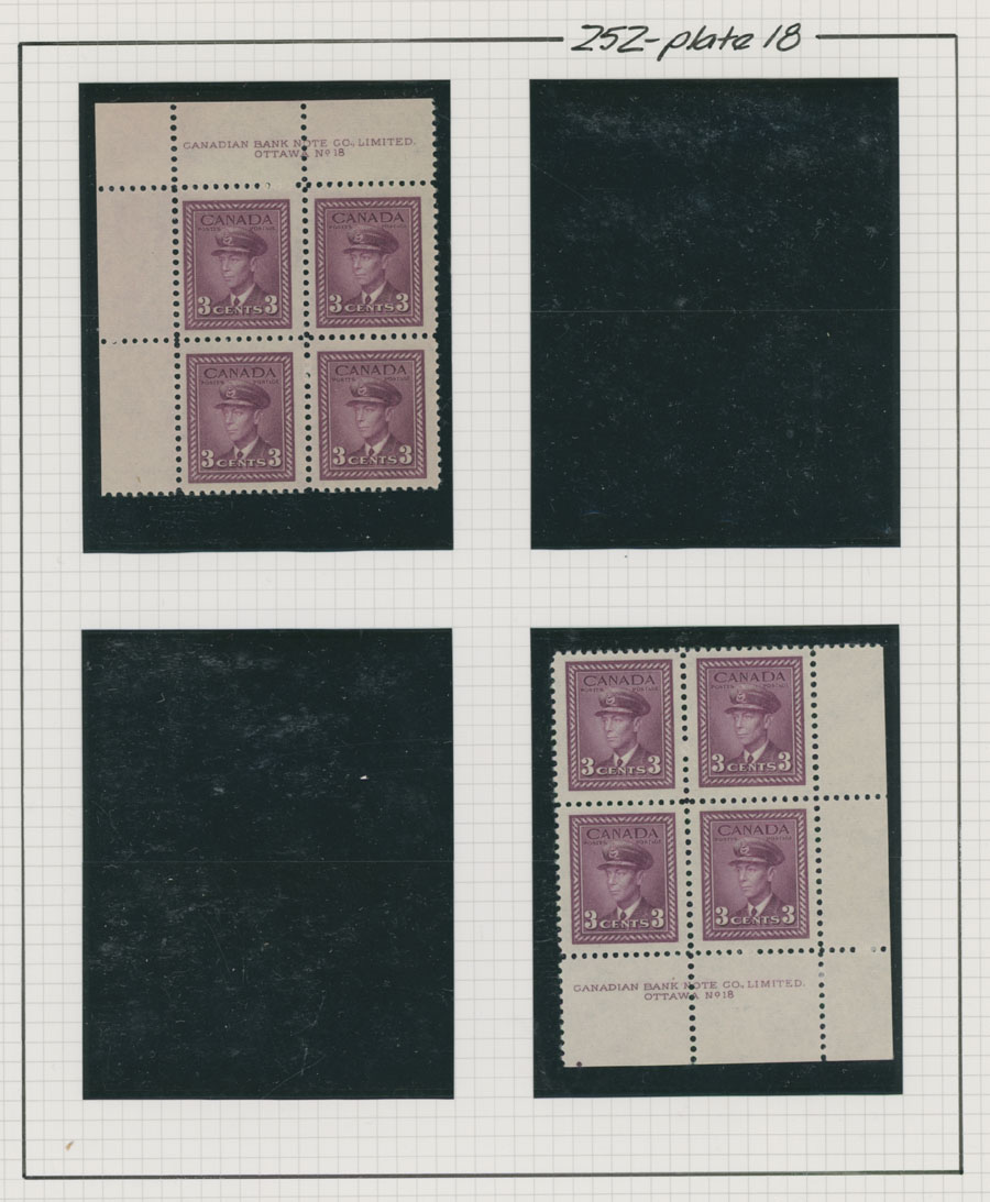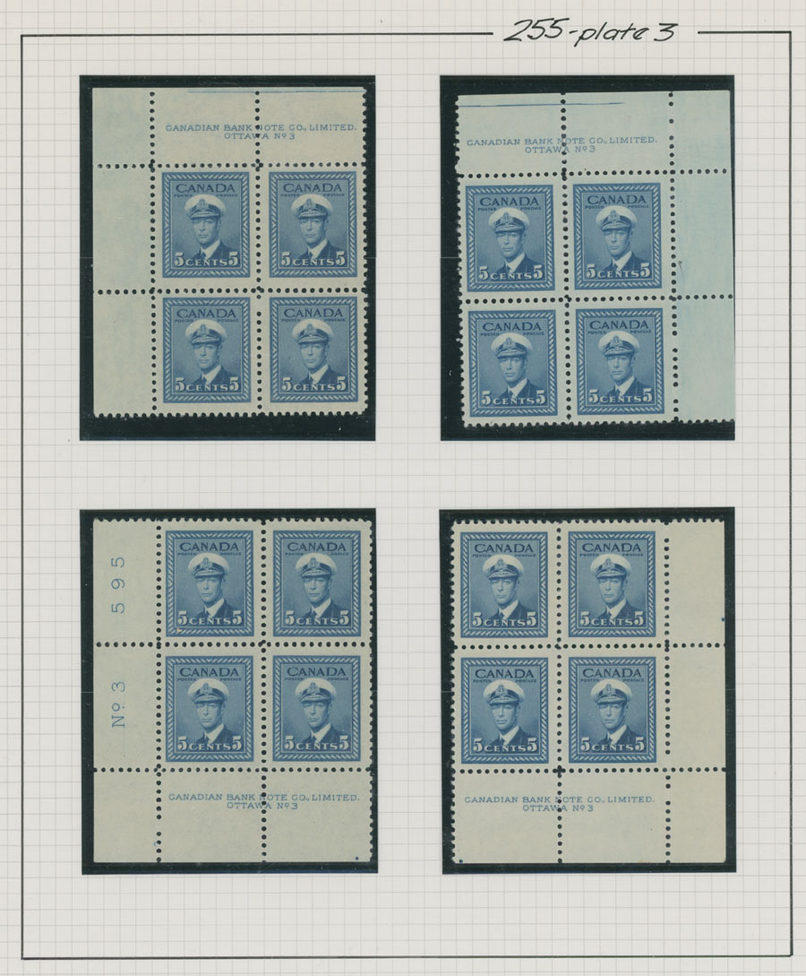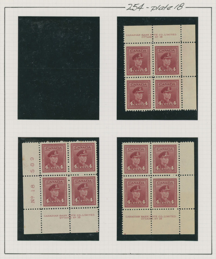 PLATE BLOCKS COLLECTION: 1942-43, 1c-8c and 10c-$1, the total is 430 blocks, including 79 matched sets (blocks from all four corners), by value – 1c – 98 blocks, 19 sets; 2c – 24 blocks, 6 sets; 3c carmine – 31 blocks, 5 sets; 3c rose violet – 95 blocks, 20 sets; 4c green black – 4 blocks, 1 set; 4c dark carmine – 129 blocks, 18 sets; 5c – 16 blocks, 4 sets; 8c – 4 blocks, 1 set; 10c – 7 blocks; 13c – 4 blocks, 1 set; 14c – 4 blocks, 1set; 20c – 6 blocks, 1 set; 50c – 4 blocks, 1 set; and $1 – 4 blocks, 1 set; occasional hinges or minor flaws possible, generally nice centering and perfect condition, full OG, NH, VF, Unitrade C.v. CAD$10,900++, Est. $1,500-$2,000, Scott #249-62