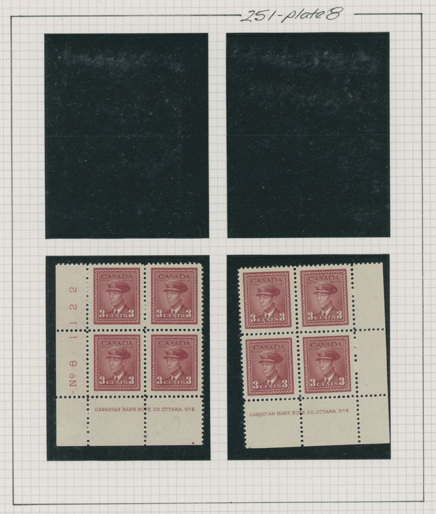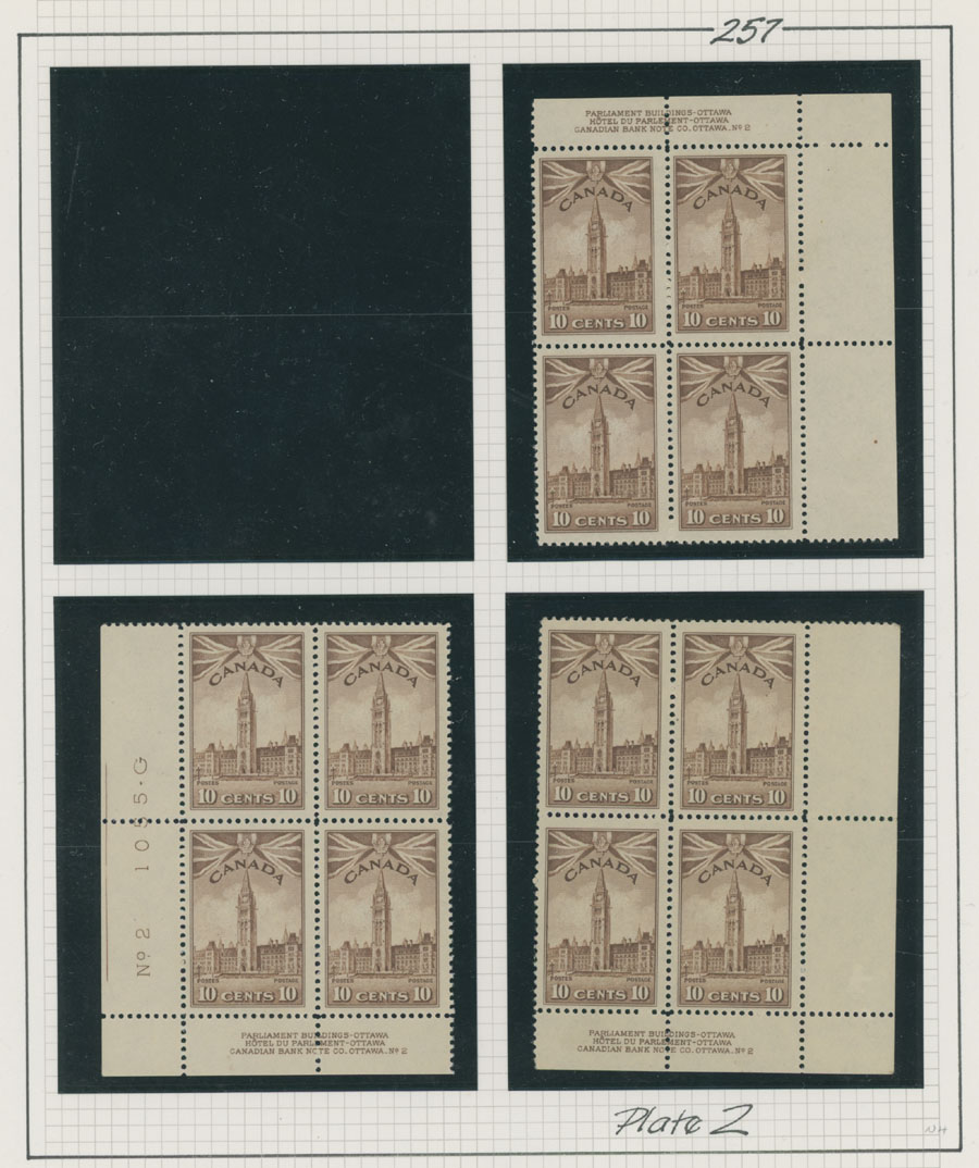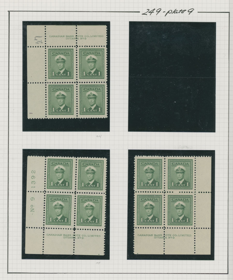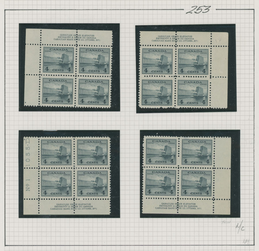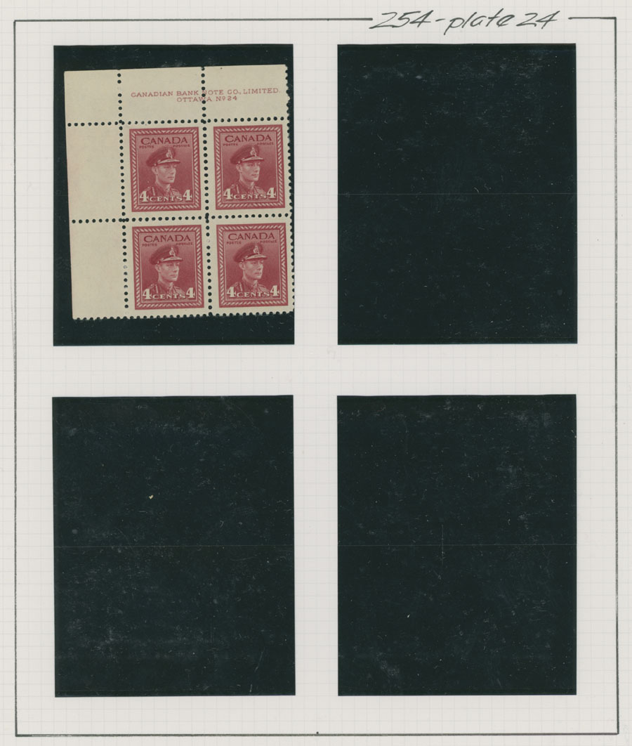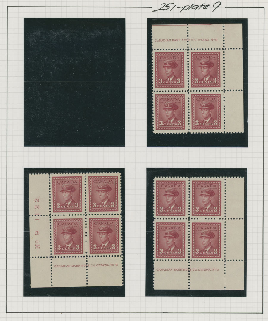 PLATE BLOCKS COLLECTION: 1942-43, 1c-8c and 10c-$1, the total is 430 blocks, including 79 matched sets (blocks from all four corners), by value – 1c – 98 blocks, 19 sets; 2c – 24 blocks, 6 sets; 3c carmine – 31 blocks, 5 sets; 3c rose violet – 95 blocks, 20 sets; 4c green black – 4 blocks, 1 set; 4c dark carmine – 129 blocks, 18 sets; 5c – 16 blocks, 4 sets; 8c – 4 blocks, 1 set; 10c – 7 blocks; 13c – 4 blocks, 1 set; 14c – 4 blocks, 1set; 20c – 6 blocks, 1 set; 50c – 4 blocks, 1 set; and $1 – 4 blocks, 1 set; occasional hinges or minor flaws possible, generally nice centering and perfect condition, full OG, NH, VF, Unitrade C.v. CAD$10,900++, Est. $1,500-$2,000, Scott #249-62