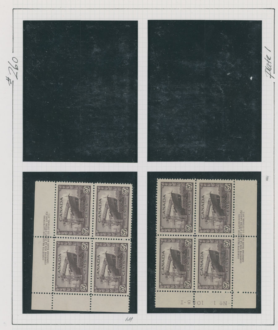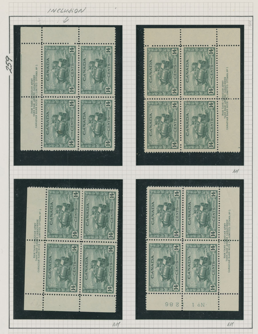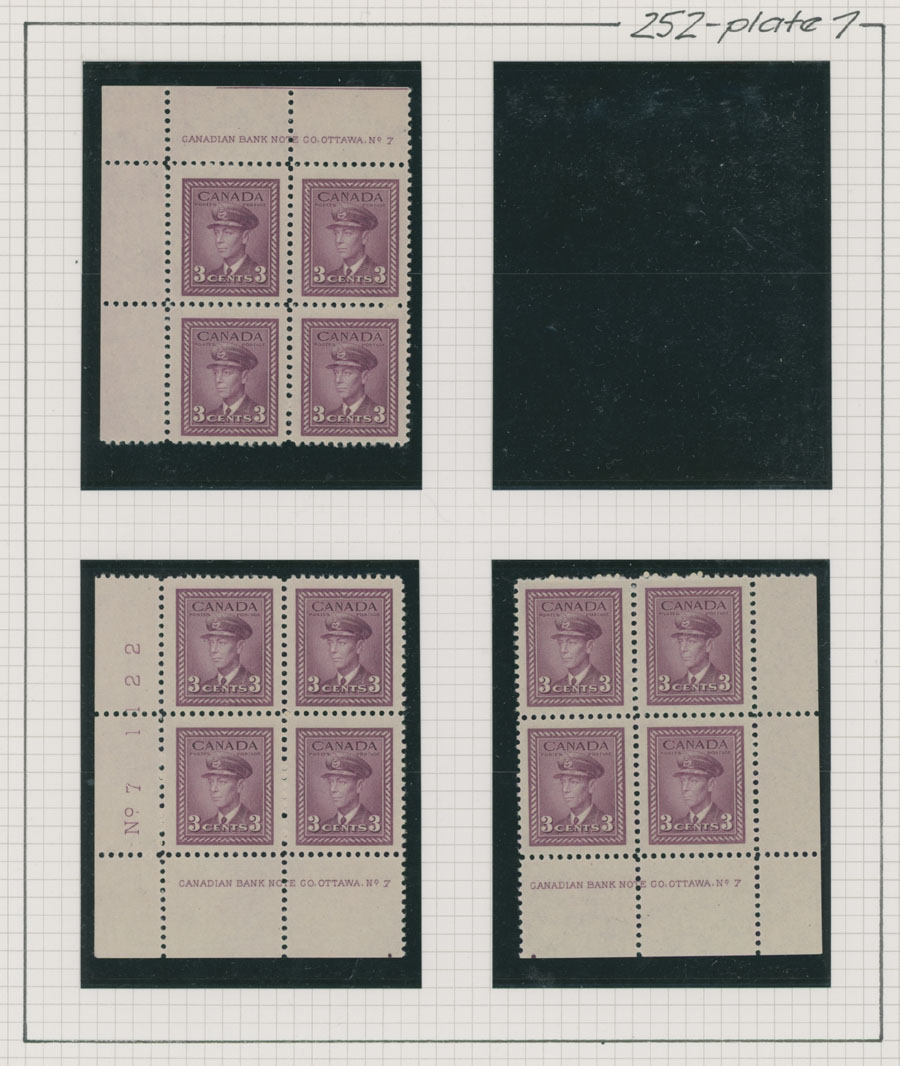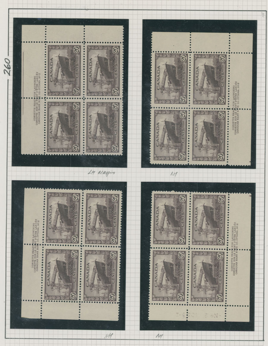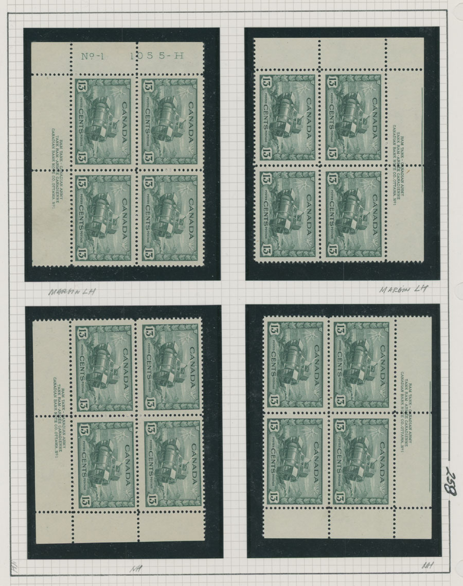 PLATE BLOCKS COLLECTION: 1942-43, 1c-8c and 10c-$1, the total is 430 blocks, including 79 matched sets (blocks from all four corners), by value – 1c – 98 blocks, 19 sets; 2c – 24 blocks, 6 sets; 3c carmine – 31 blocks, 5 sets; 3c rose violet – 95 blocks, 20 sets; 4c green black – 4 blocks, 1 set; 4c dark carmine – 129 blocks, 18 sets; 5c – 16 blocks, 4 sets; 8c – 4 blocks, 1 set; 10c – 7 blocks; 13c – 4 blocks, 1 set; 14c – 4 blocks, 1set; 20c – 6 blocks, 1 set; 50c – 4 blocks, 1 set; and $1 – 4 blocks, 1 set; occasional hinges or minor flaws possible, generally nice centering and perfect condition, full OG, NH, VF, Unitrade C.v. CAD$10,900++, Est. $1,500-$2,000, Scott #249-62