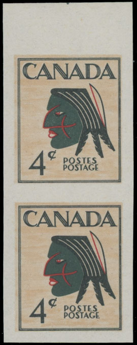 1953(c), Indian Head imperforate essay of proposed design for multicolored 4c definitive stamp, top sheet margin vertical pair, printed on gummed stamp paper, NH, VF, Est. $200-$250