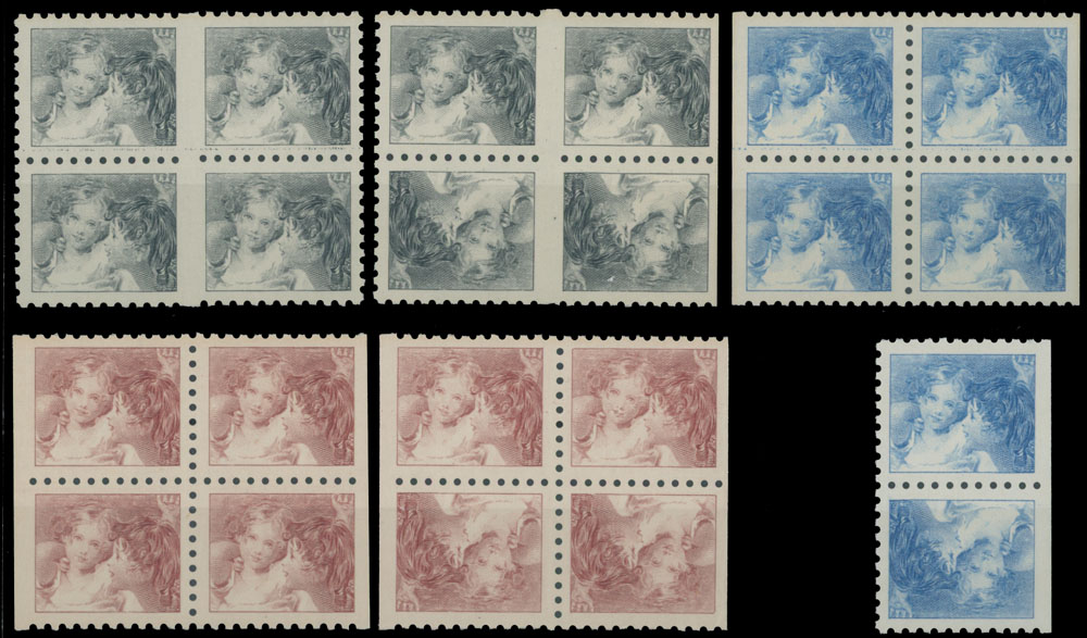 1967, Baby Sisters, experimental stamps with no value indicated for test booklet, five blocks of four (two tete-beche blocks) and vertical tete-beche pair, colors – gray, bright blue and carmine, blocks in gray imperf vertically between stamps, others with straight edges, no gum as issued, NH, VF, Est. $400-$450
