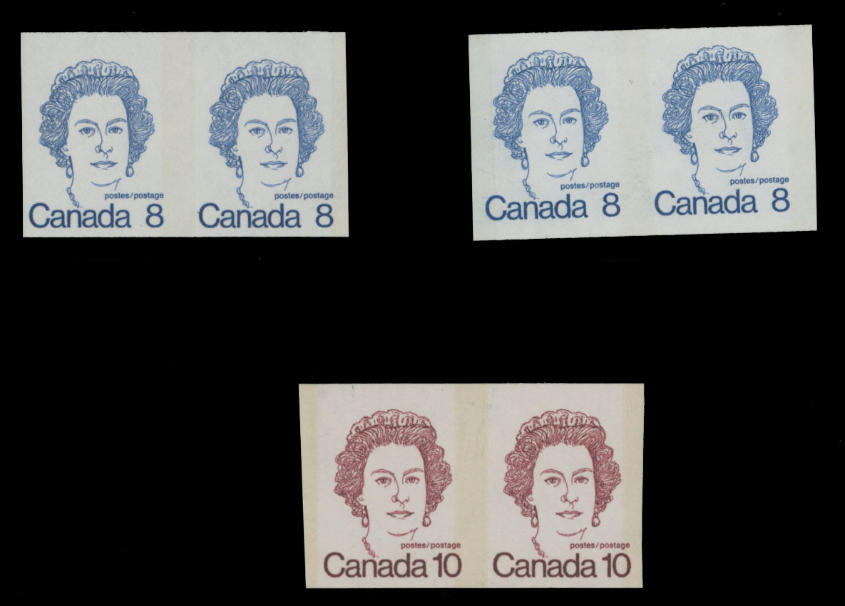 1974, Caricature Definitives, coil stamps, Queen Elizabeth II, 8c blue, two horizontal imperforate pairs on low fluorescent (LF) and hibrite (HB) papers, in addition 10c dark carmine, horizontal imperforate pair on dull fluorescent paper (DF), full OG, NH, VF, Unitrade #604a, iii, 605a, C.v. CAD$675, Est. $200-$250, Scott #604a, var, 605a