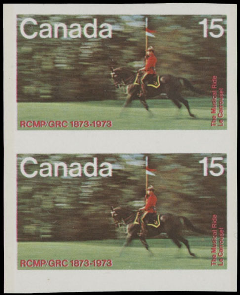 1973, R.C.M.P. Musical Ride, 15c multicolored, vertical imperforate pair in flawless condition, full OG, NH, VF, C.v. $375, Unitrade C.v. CAD$600, Est. $150-$200 , Scott #614a