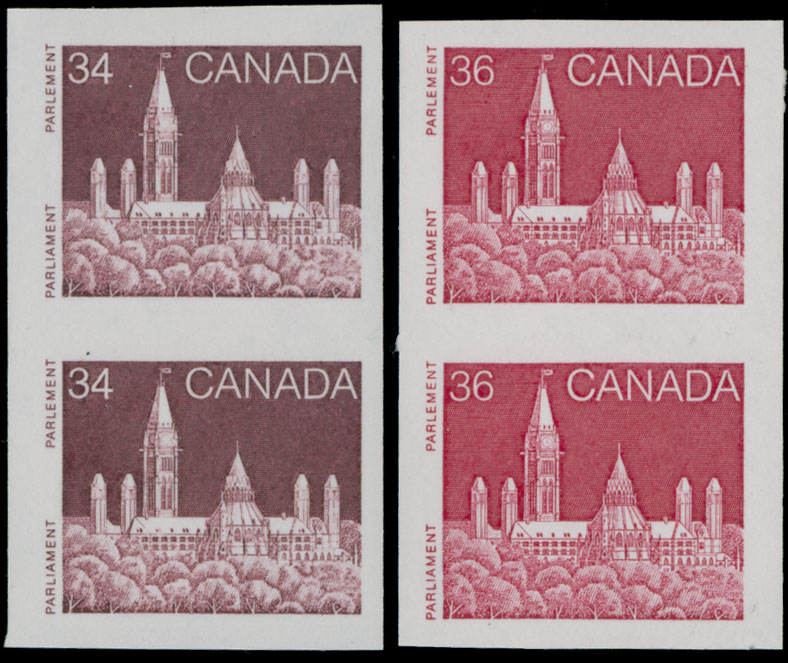 1985-87, Parliament Buildings, 34c red brown and 36c dark red, two vertical imperforate pairs, full OG, NH, VF, C.v. $385, Unitrade C.v. CAD$575, Est. $150-$180 , Scott #952a-53a
