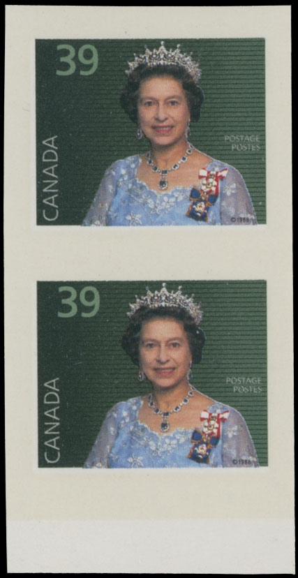 1990, Queen Elizabeth II, 39c multicolored with background in green, vertical imperforate pair, full OG, NH, VF, C.v. $500,Unitrade C.v. CAD$700, Est. $150-$200 , Scott #1167c