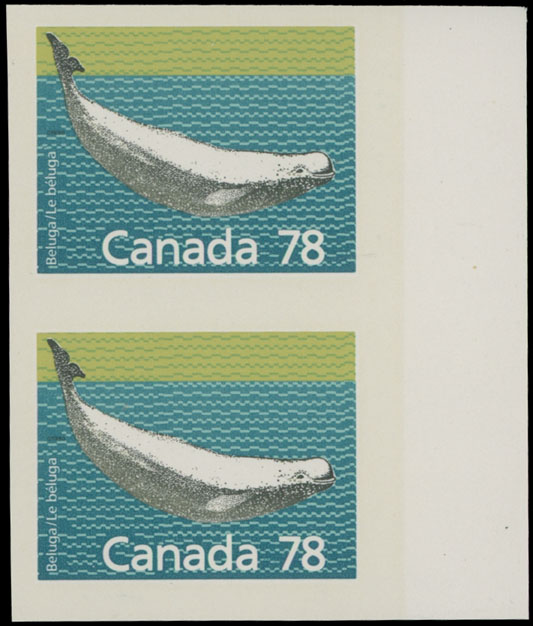 1990, Beluga Whale, 78c multicolored, right sheet margin vertical imperforate pair, full OG, NH, VF, C.v. $850, Unitrade C.v. CAD1,200, Est. $250-$300 , Scott #1179d