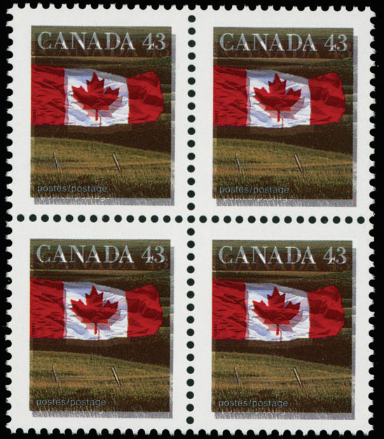 1992, Flag over the Field, 43c multicolored, double impression of red and gray lilac colors, block of four, full OG, NH, VF, Unitrade #1359ii, Est. $400-$500 , Scott #1359 var