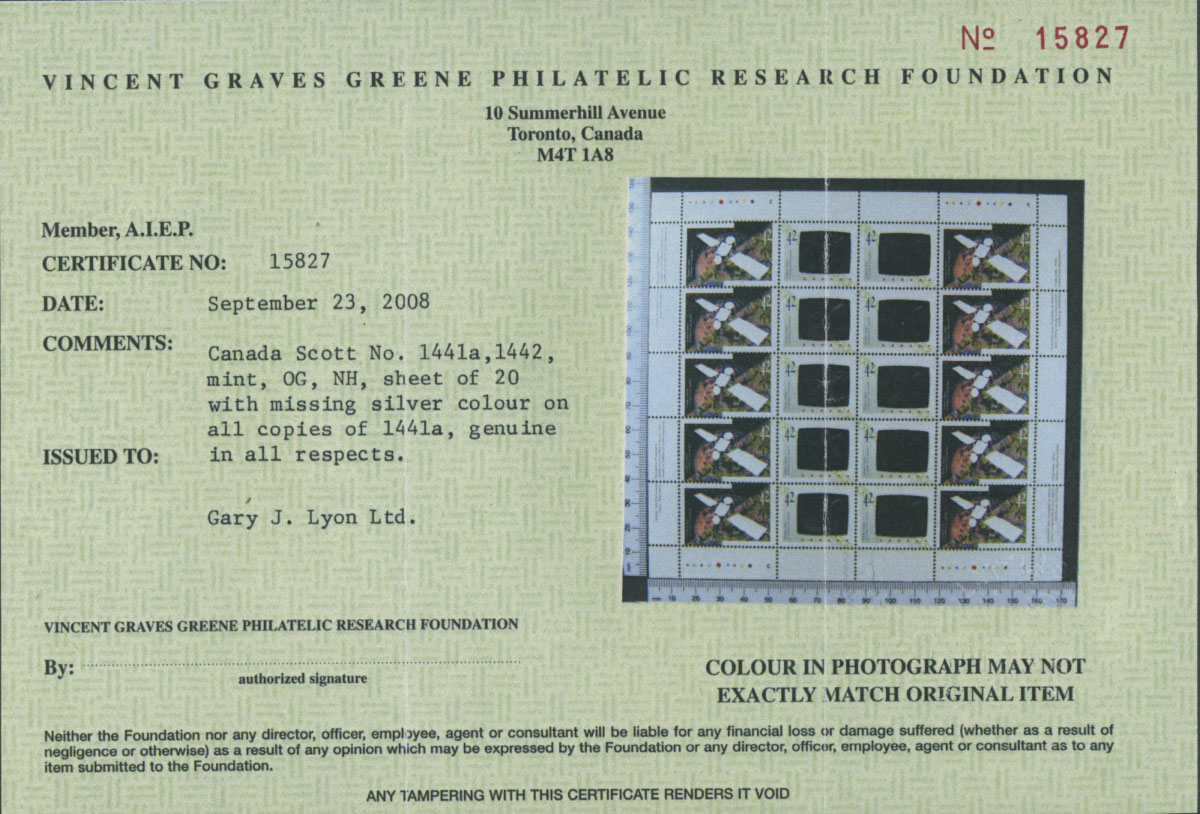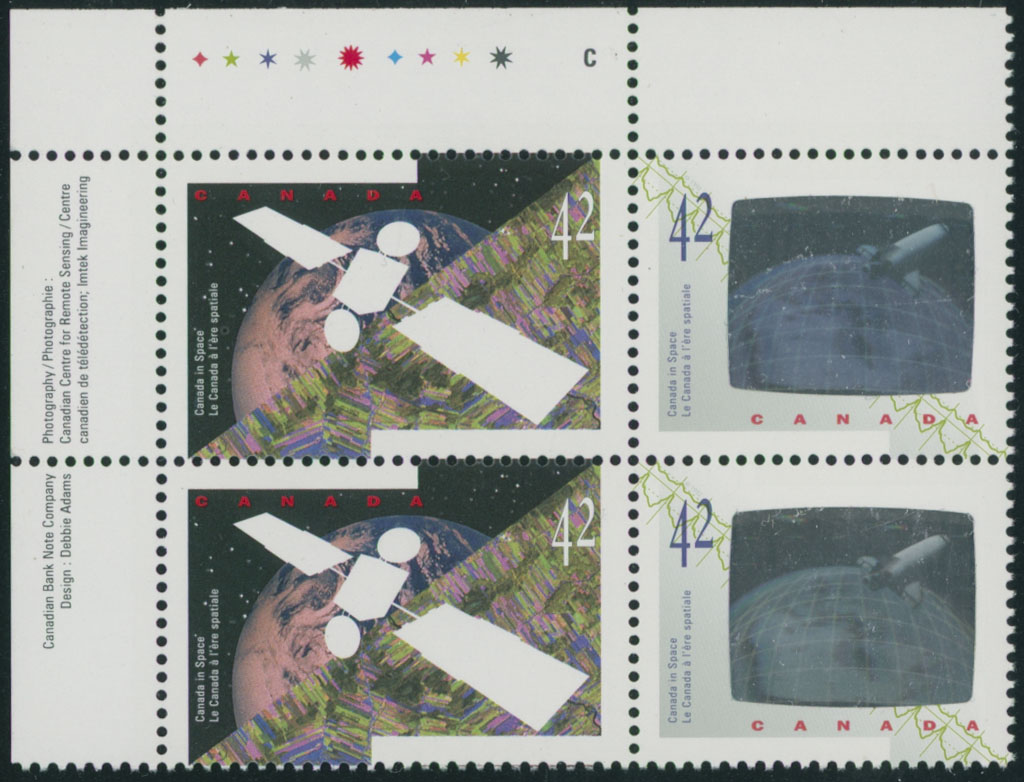 1992, Canada in Space, 42c x2 multicolored, top left corner sheet margin plate No. block of four containing two horizontal se-tenant pairs, left stamps have silver color omitted, marginal imprint and control markings, full OG, NH, VF and reportedly unique positional piece, since only one pane of 20 with omitted silver (10 stamps) was discovered, V. Greene certificate for the pane, C.v. $5,500, Unitrade C.v. CAD$7,500 for two pairs, Est. $4,000-$5,000, Scott #1441a