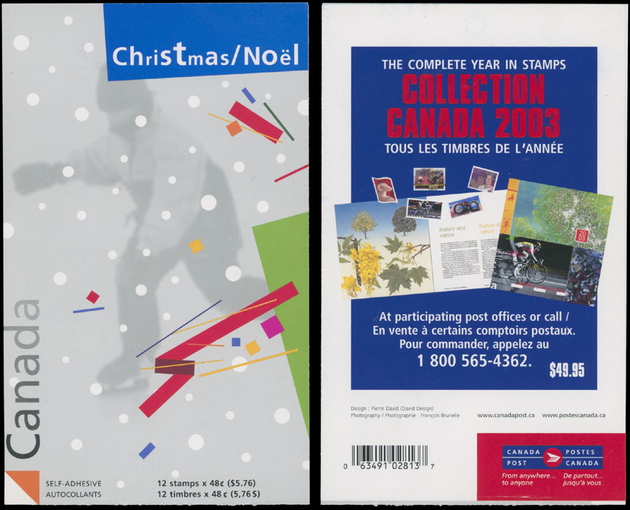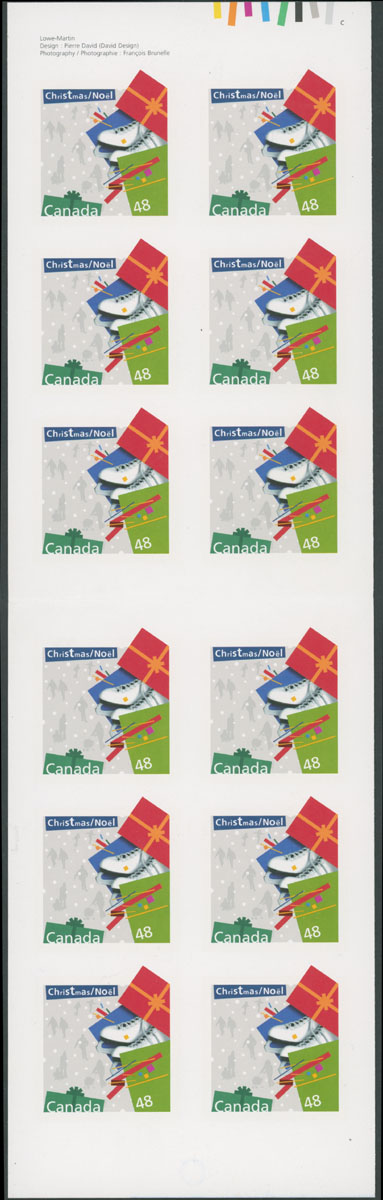 2003, Christmas, Ice Skates, 48c multicolored, complete self-adhesive booklet of 12 stamps, die cutting omitted, backing paper intact, VF and rare, C.v. $2,250++, Unitrade C.v. CAD$3,000 as six pairs with die cutting omitted, Est. $1,200-$1,500 , Scott #2004b