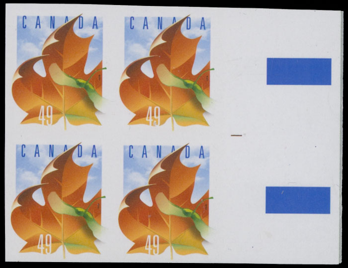 2003, Maple Leaves, 49c multicolored, self-adhesive coil stamps in right sheet margin block of four (two uncut vertical pairs) with die cutting omitted, control markings in blue on the edge, backing paper intact, VF, C.v.$300++, Unitrade C.v. CAD$400 as two pairs, Est. $120-$150, Scott #2008a
