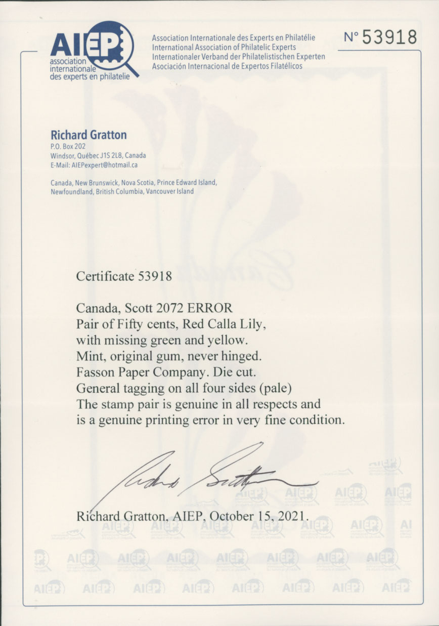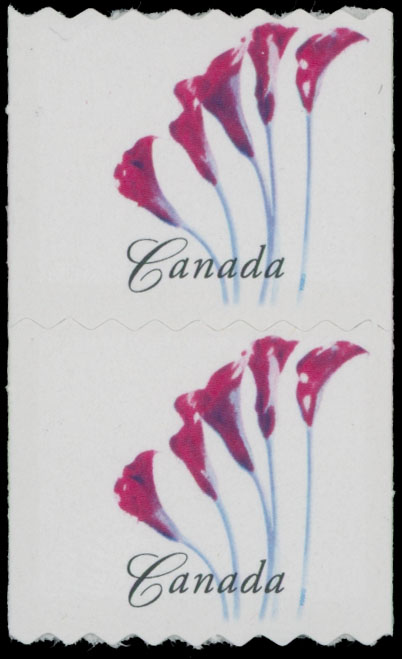 2004, Red Calla Lily, (50c) multicolored, vertical pair self-adhesive coil stamps, green and yellow colors omitted, backing paper intact, VF and rare, R. Gratton certificate, Est. $500-$600 , Scott #2072 var