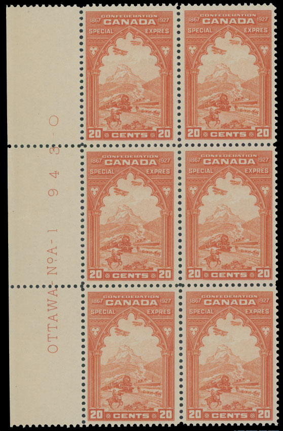 1927, Confederation, 20c orange, left sheet margin plate No.1 block of six (2×3), inscription on margin reads: ”OTTAWA No. A-1 943 O”, perfect centering, full OG, NH, VF, Unitrade C.v. CAD$875, Est. $250-$300 , Scott #E3