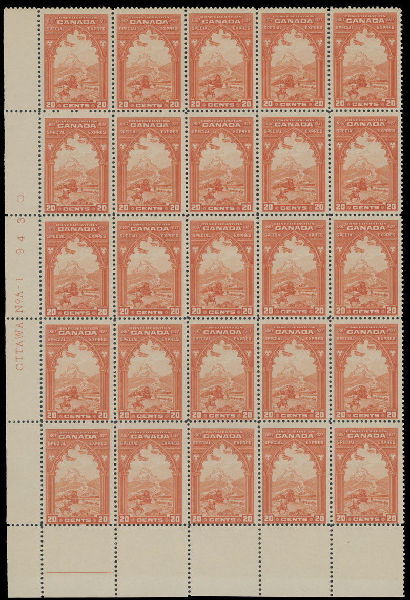 1927, Confederation, 20c orange, bottom left corner sheet margin block of 25 (5×5), inscription on left margin reads: ”OTTAWA No.A-1 943 O”, minor marginal separations, full OG, NH, F/VF (counted as fine), Unitrade C.v. CAD $1,262.50, Est. $300-$350, Scott #E3