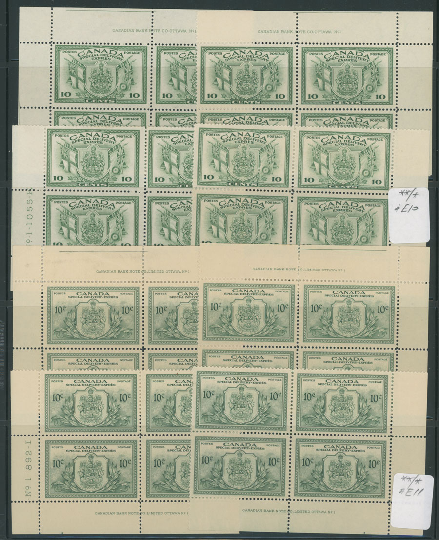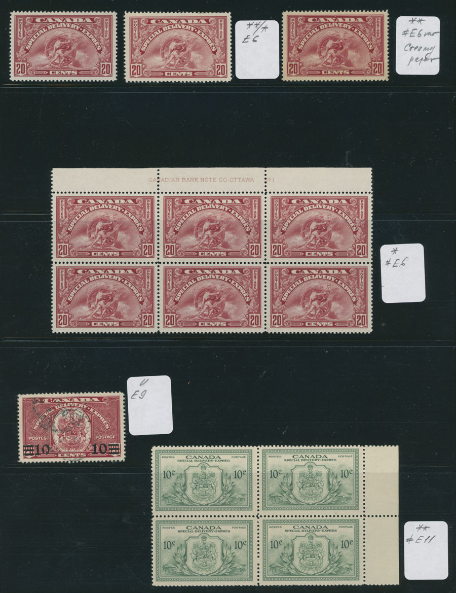 NEAT GROUP OF SPECIAL DELIVERY STAMPS: 1898-1946, 63 mostly mint stamps (7 – used), including 11 blocks and plate blocks of four or six, starting with the first issue, including three unused values (one – hinged, two with redistributed gum, counted as hinged), generally fresh, full OG or used, F/VF, Unitrade C.v. over CAD$2,400, Est. $400-$500, Scott #E1/11