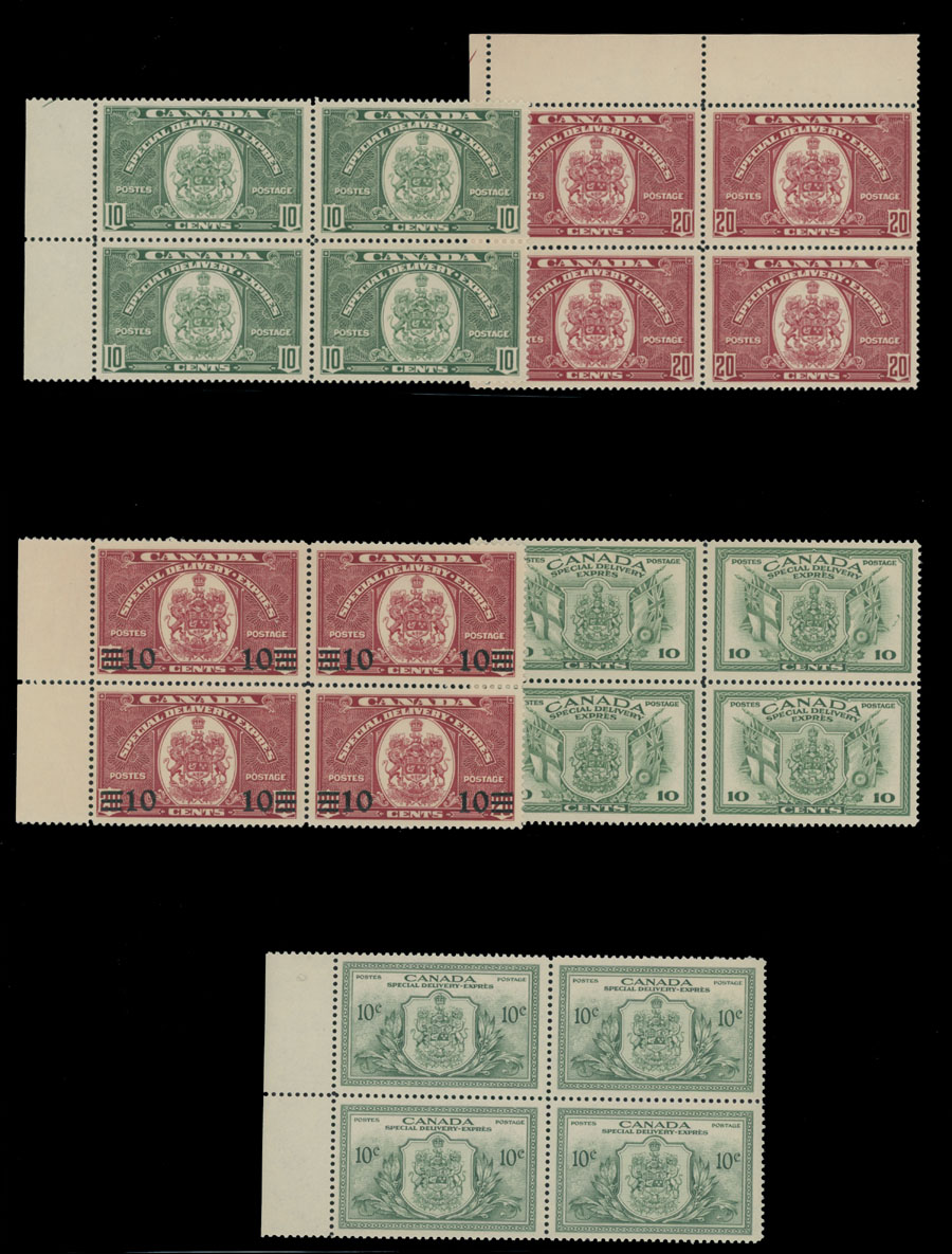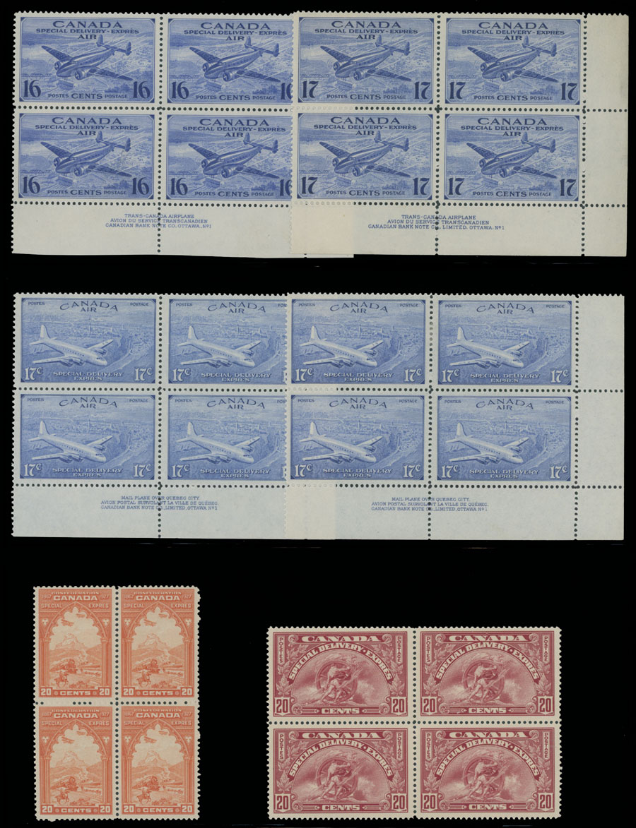 SELECTION OF MULTIPLES: 1927-46, 11 blocks of four with premium centering, including four plate blocks for Air Mail Special Delivery and seven for Special Delivery, including Confederation 20c orange, all with full OG, NH, VF, Unitrade C.v. is over CAD$1,300, Est. $200-$250, Scott #CE1-4, E3/11
