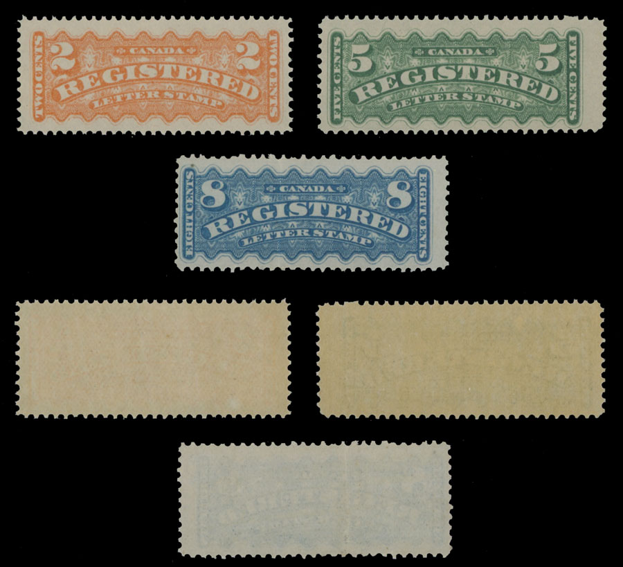 1875-76, 2c orange, 5c dark green and 8c dull blue, complete set of three, full OG with slight waves on 8c stamp, fine (5c and 8c) to very fine (2c), scarce never hinged, C.v. $4,610, Unitrade C.v. CAD $2,850, Est. $600-$700, Scott #F1-3