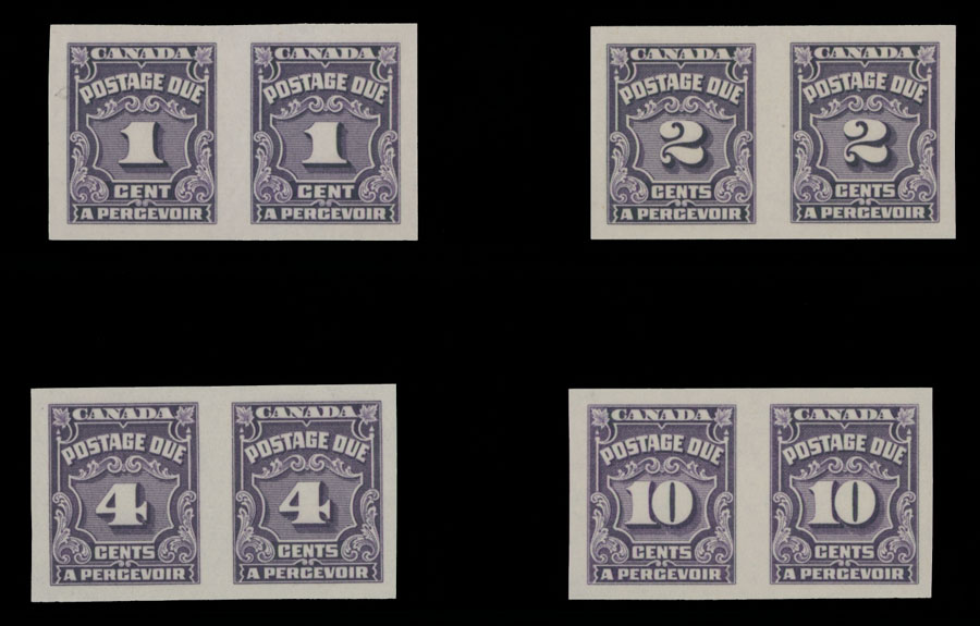 1935, Numerals, the fourth issue, 1c, 2c, 4c and 10c, imperforate set of four in horizontal imperforate pairs (only these values exist imperf), full OG, NH, VF, C.v. $1,300, Unitrade C.v. CAD$1,800, Est. $600-$700 , Scott #J15a-16a, J17a, J20a
